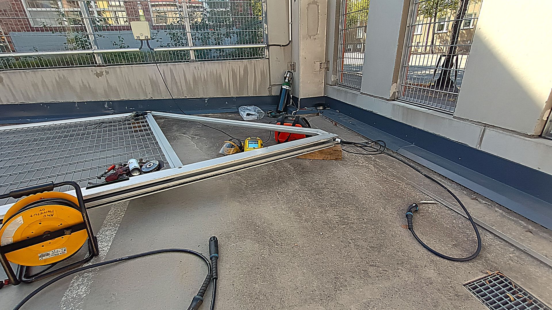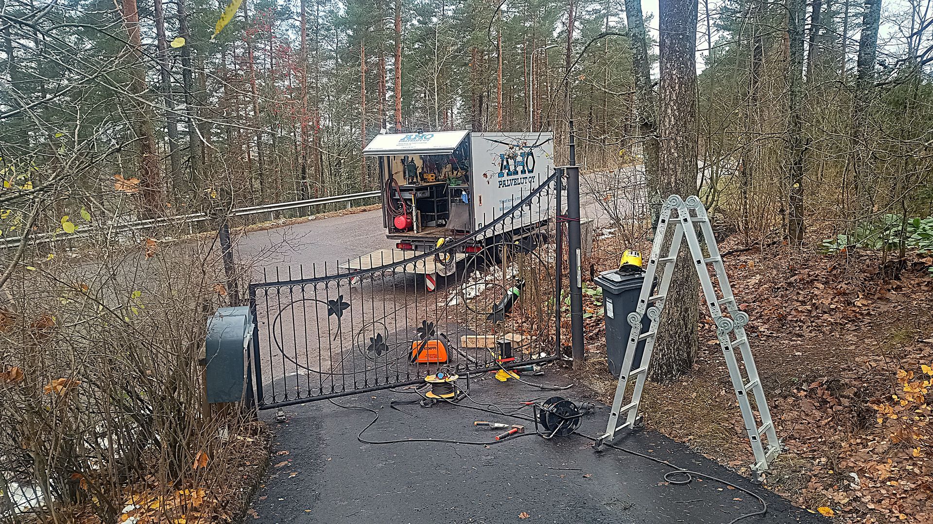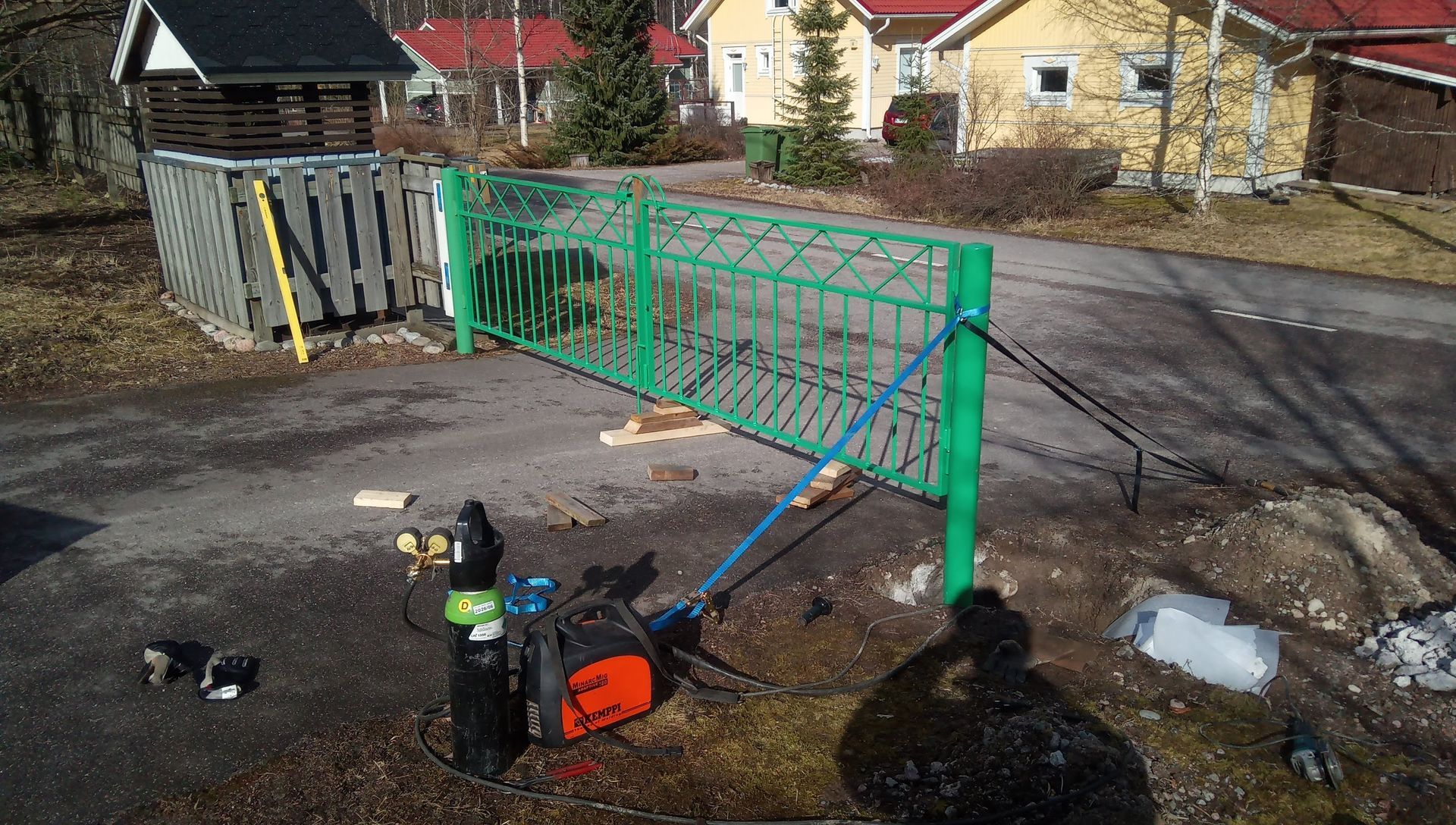 Vääntyneen portin metallirakenteiden korjaus, uudelleen pulverimaalaus ja lopuksi hitsaamalla kiinnitys maan alla olevaan tukipalkkiin.