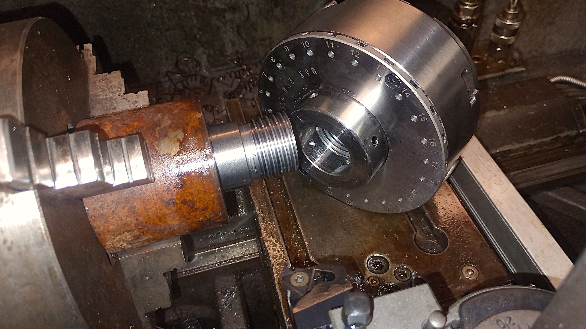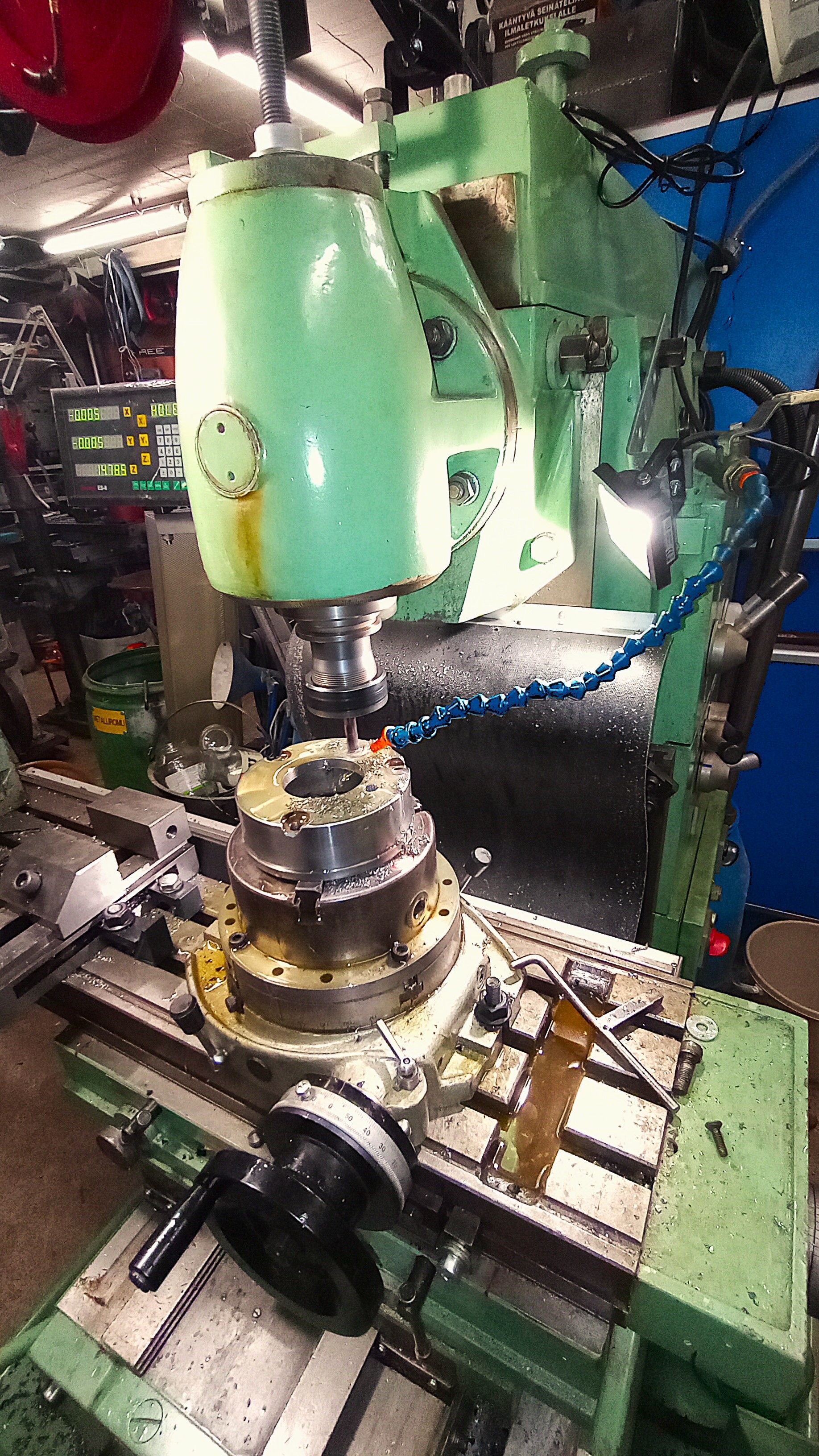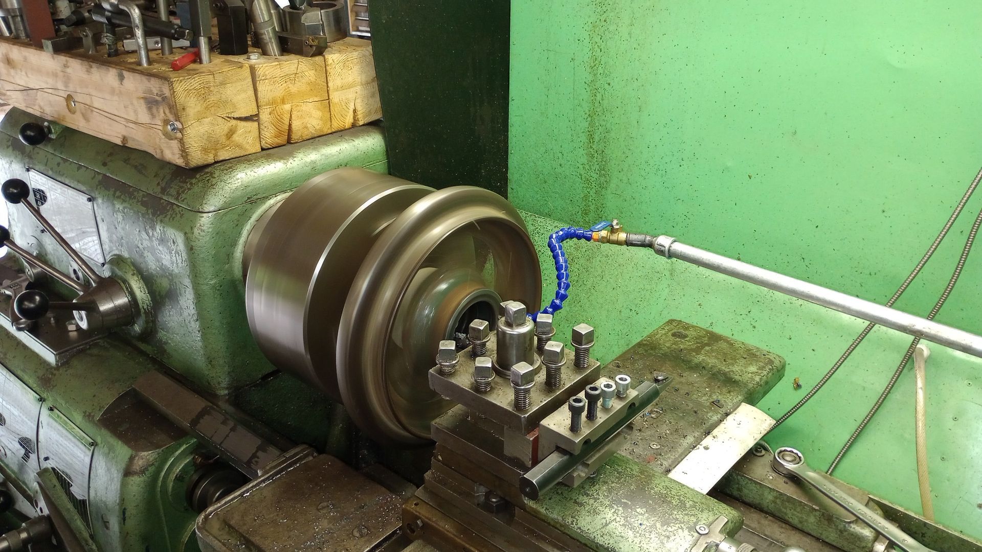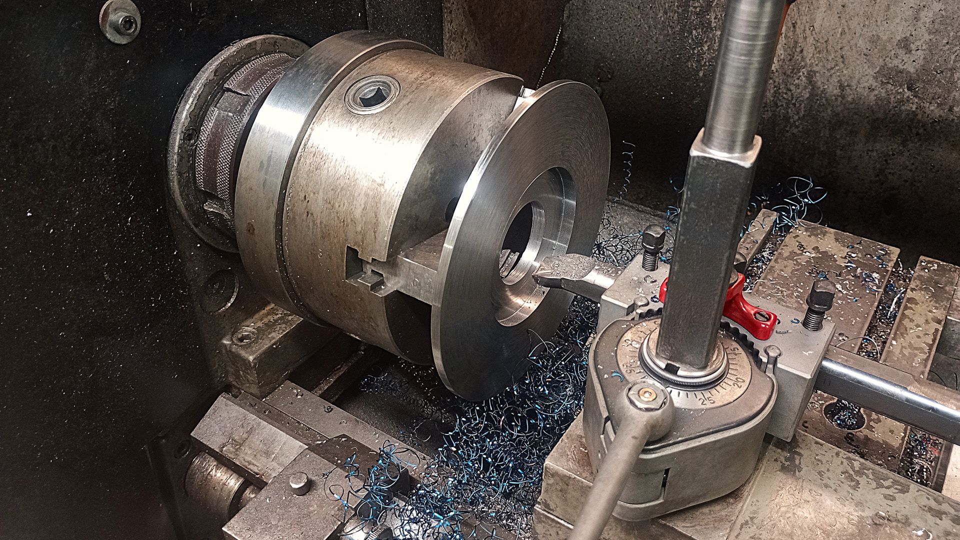 Kaivinkoneen telapyörän laakeripesät olivat kuluneet. Valmistettiin uudet ja tässä niitä sorvataan.