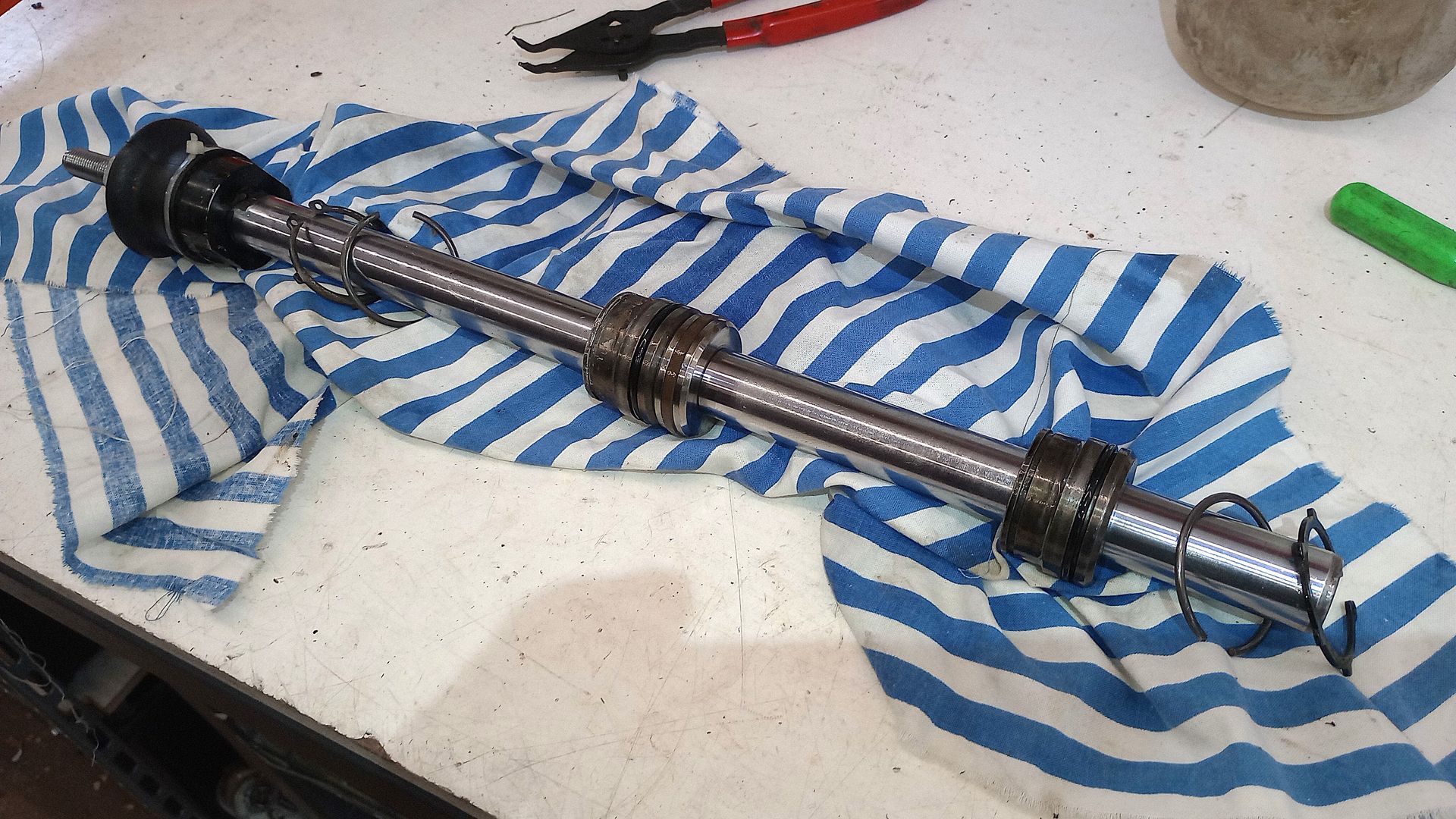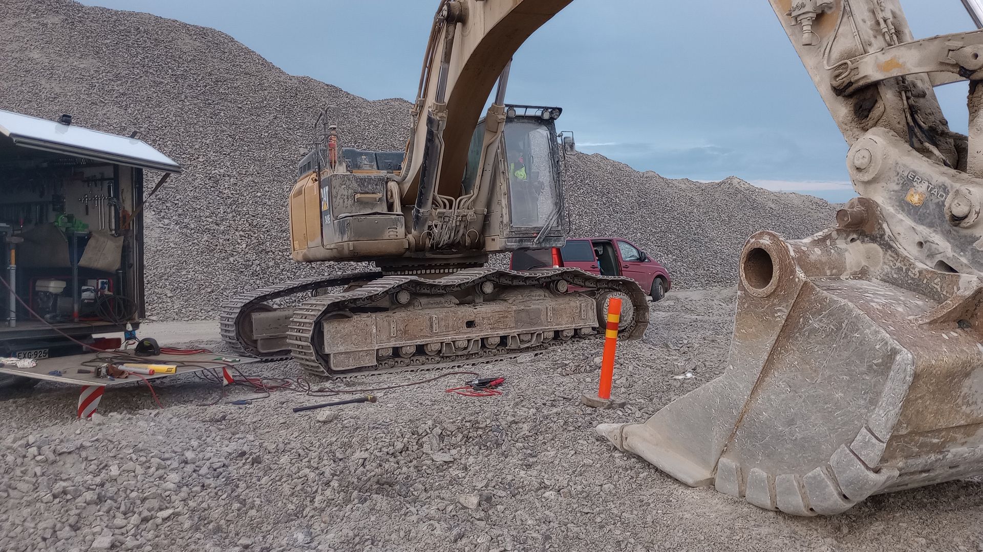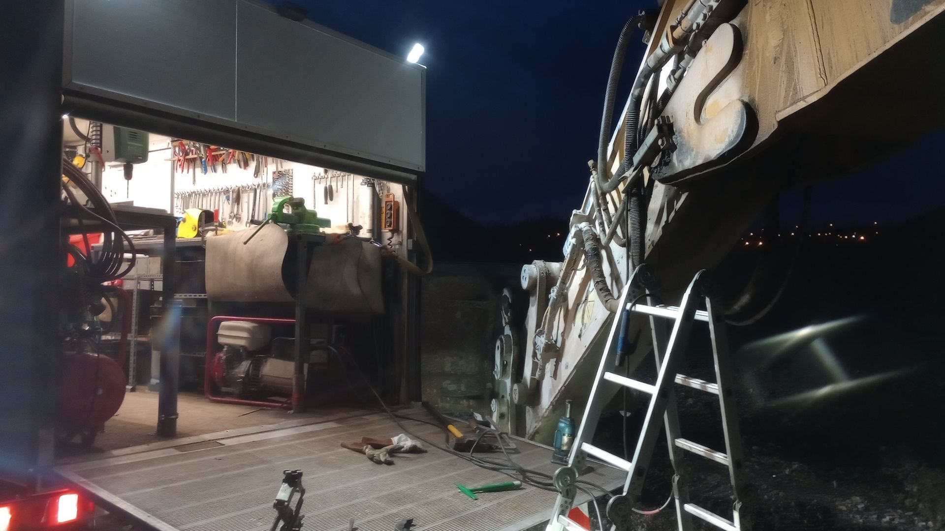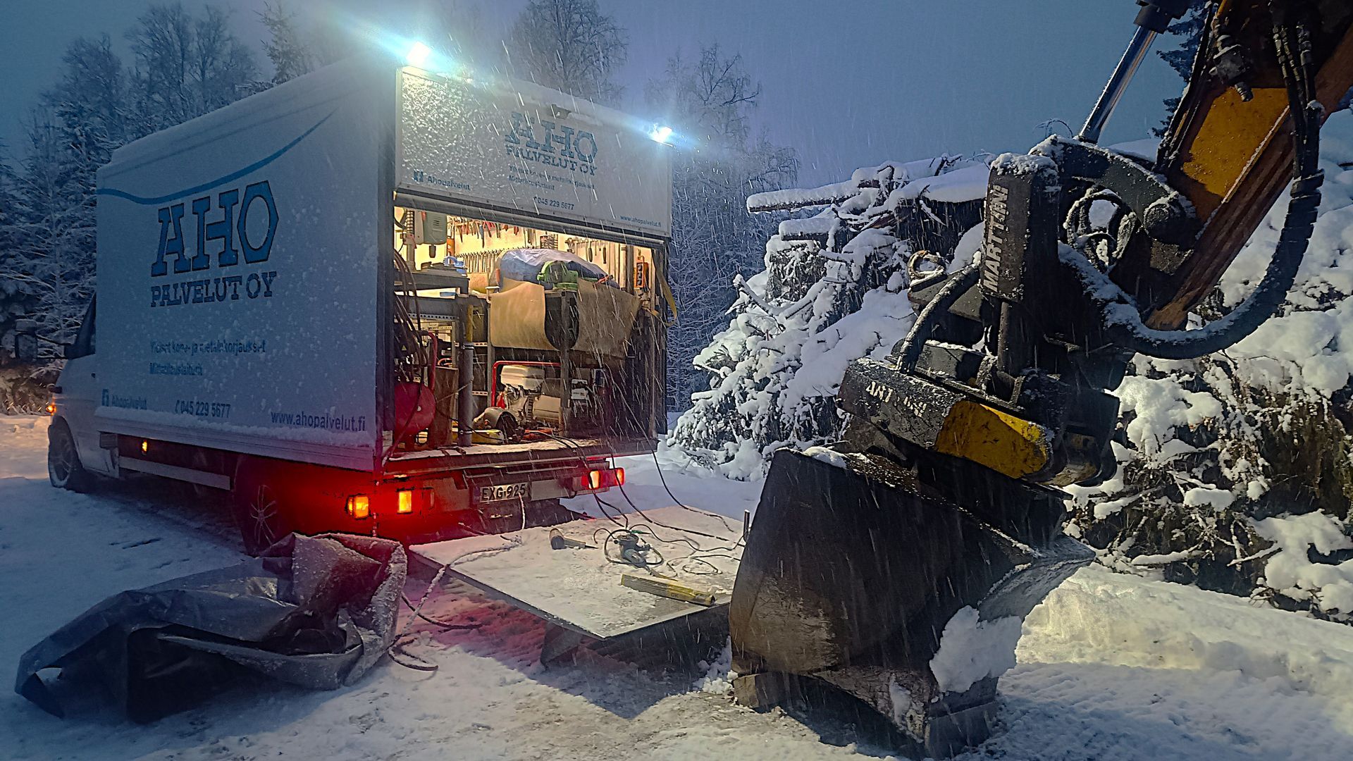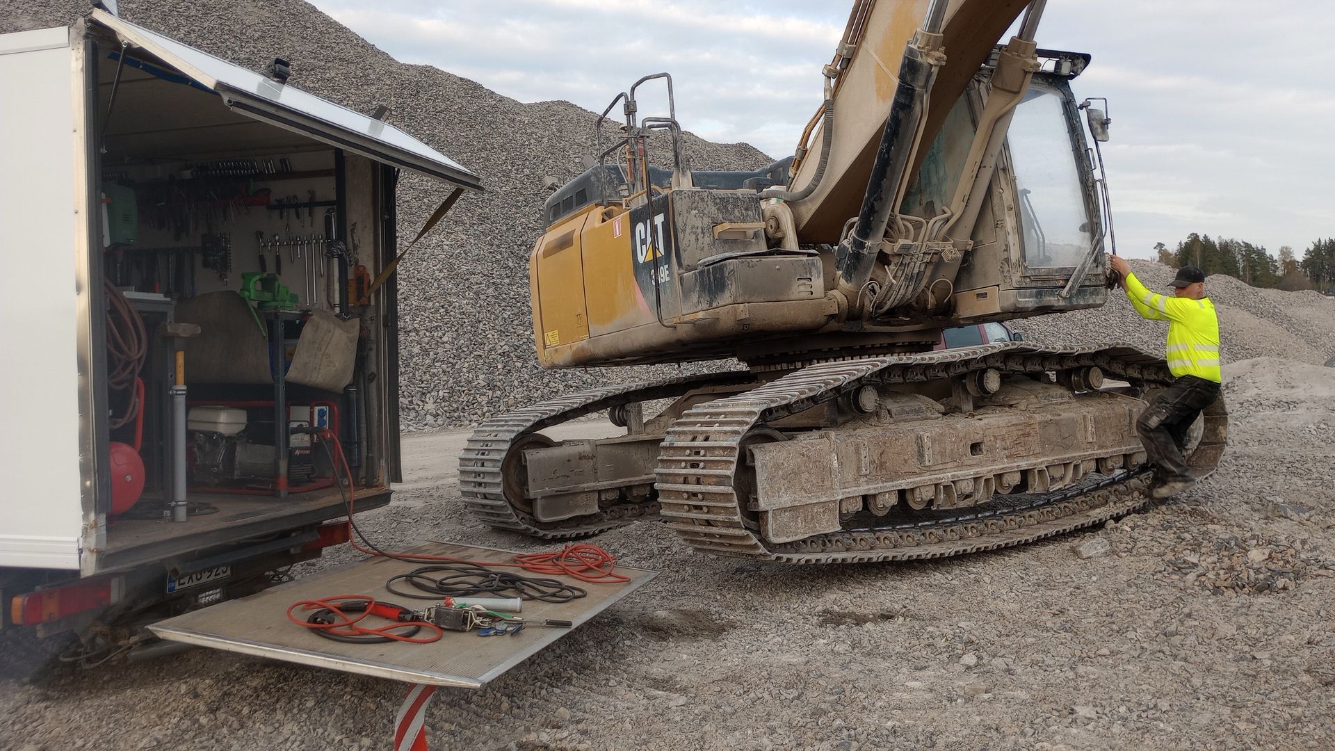 Suuren kaivuupuomin tapin hätäapukorjausta, koska tappi oli kulunut ja osin jo lähtenyt irti. Perimmäinen syy moiselle oli rasvausputken katkeaminen ja sen jälkeinen kaivuutyö ilman tapin voitelua.