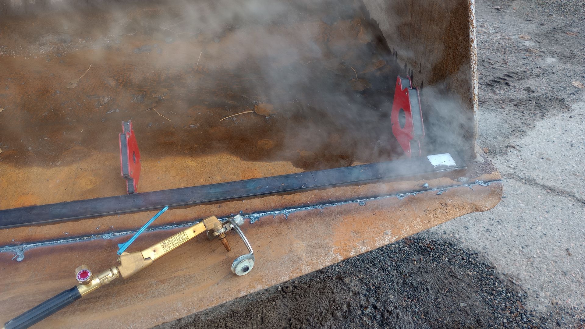 Suuren sorakauhan kunnostusta huulilevyn kulumisen johdosta. Aluksi polttoleikataan vanhaa pois.