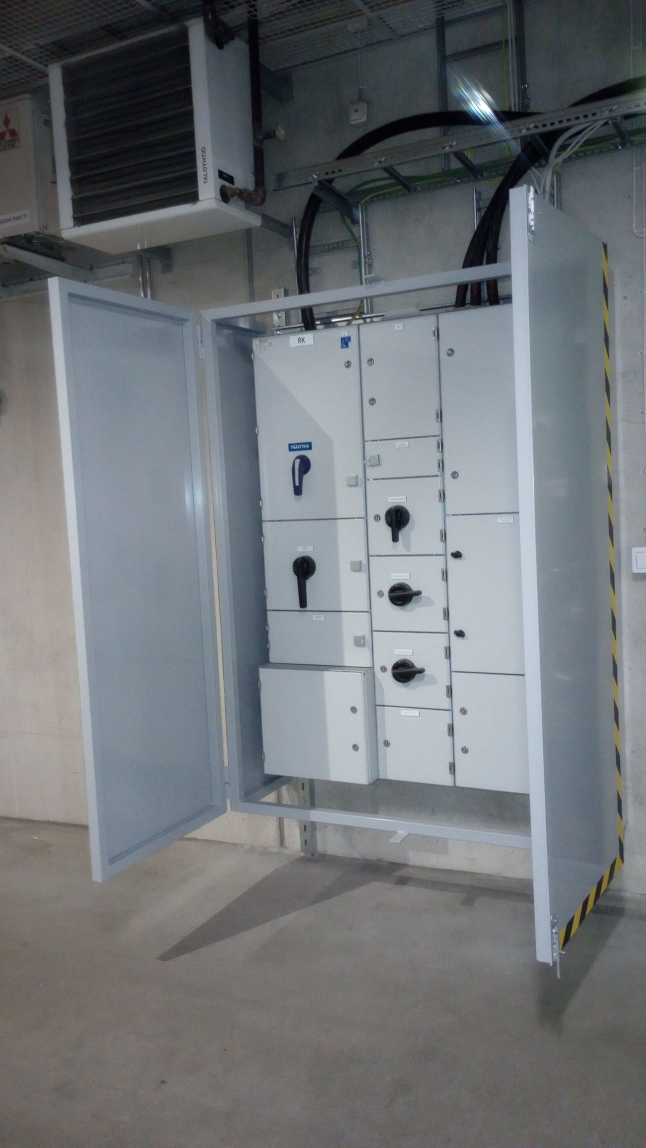 Taloyhtiön autohallin sähkökeskuksen ympärille valmistettu suojakotelo.