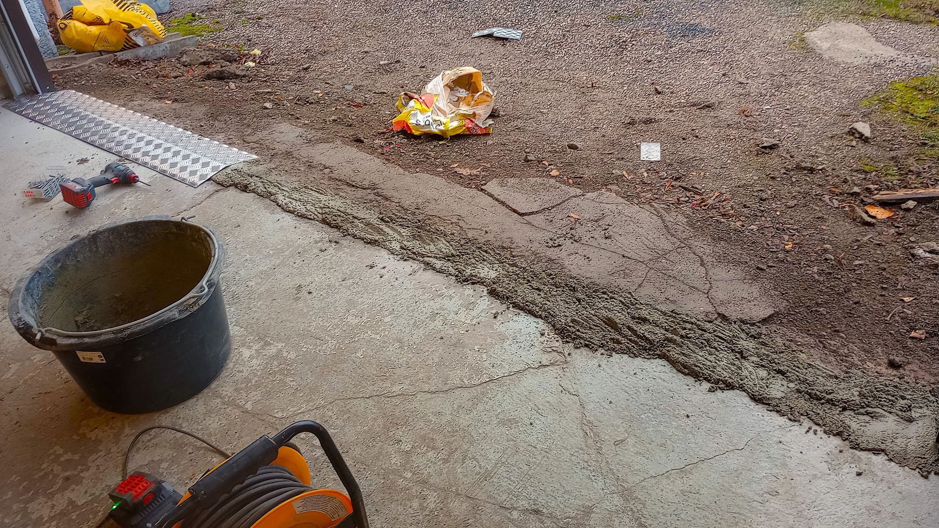 Autotallin ovikynnyksen rakentamista. Kynnyslevyä ei voi asentaa sellaisenaan, alle on valettava tukeva betonivalu, muuten ei kestä aikojen saatossa.