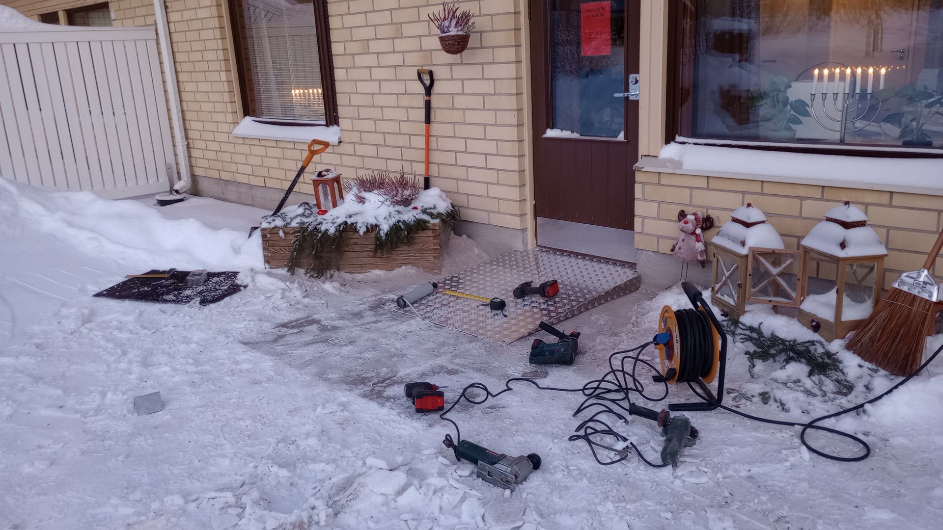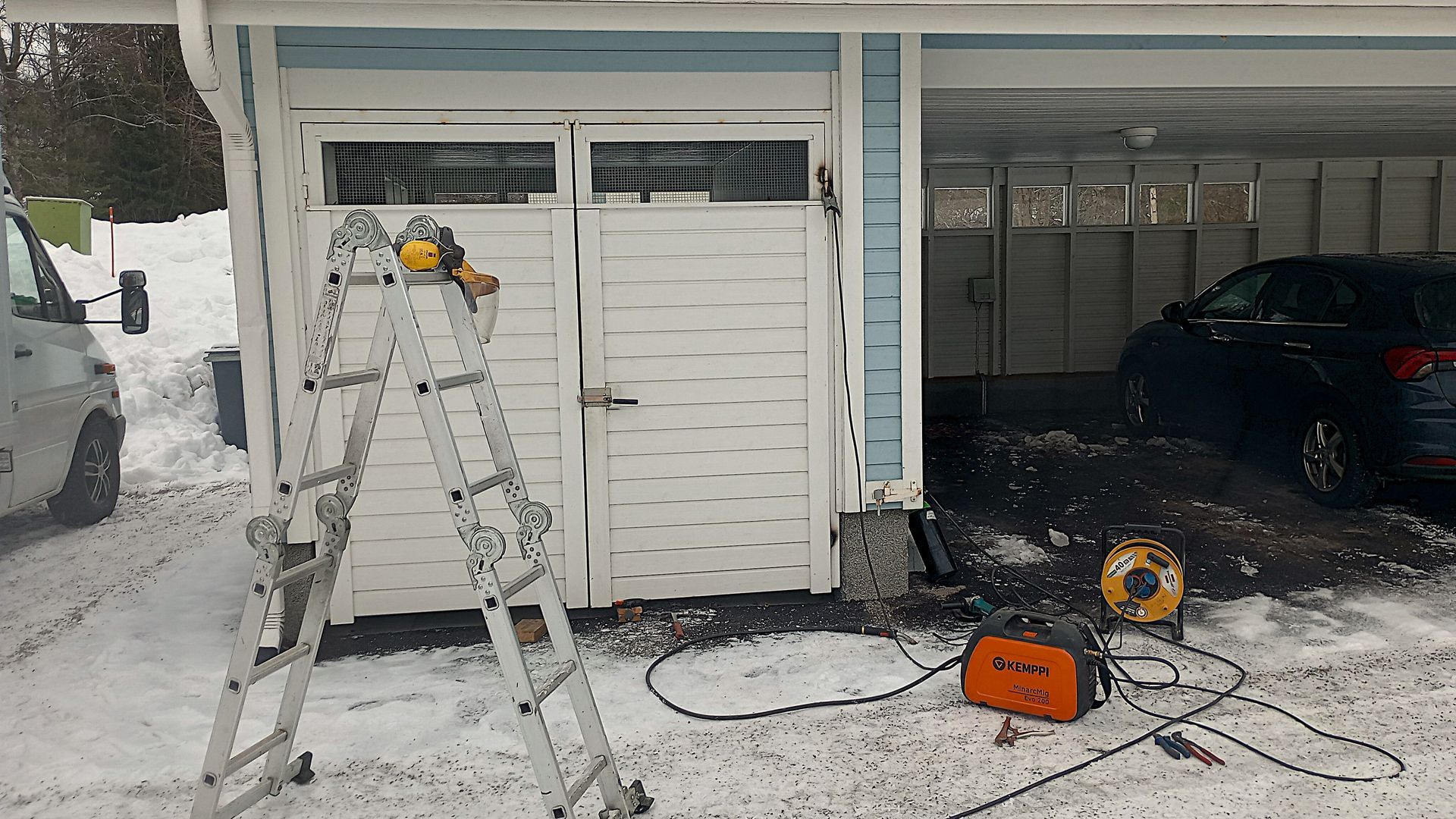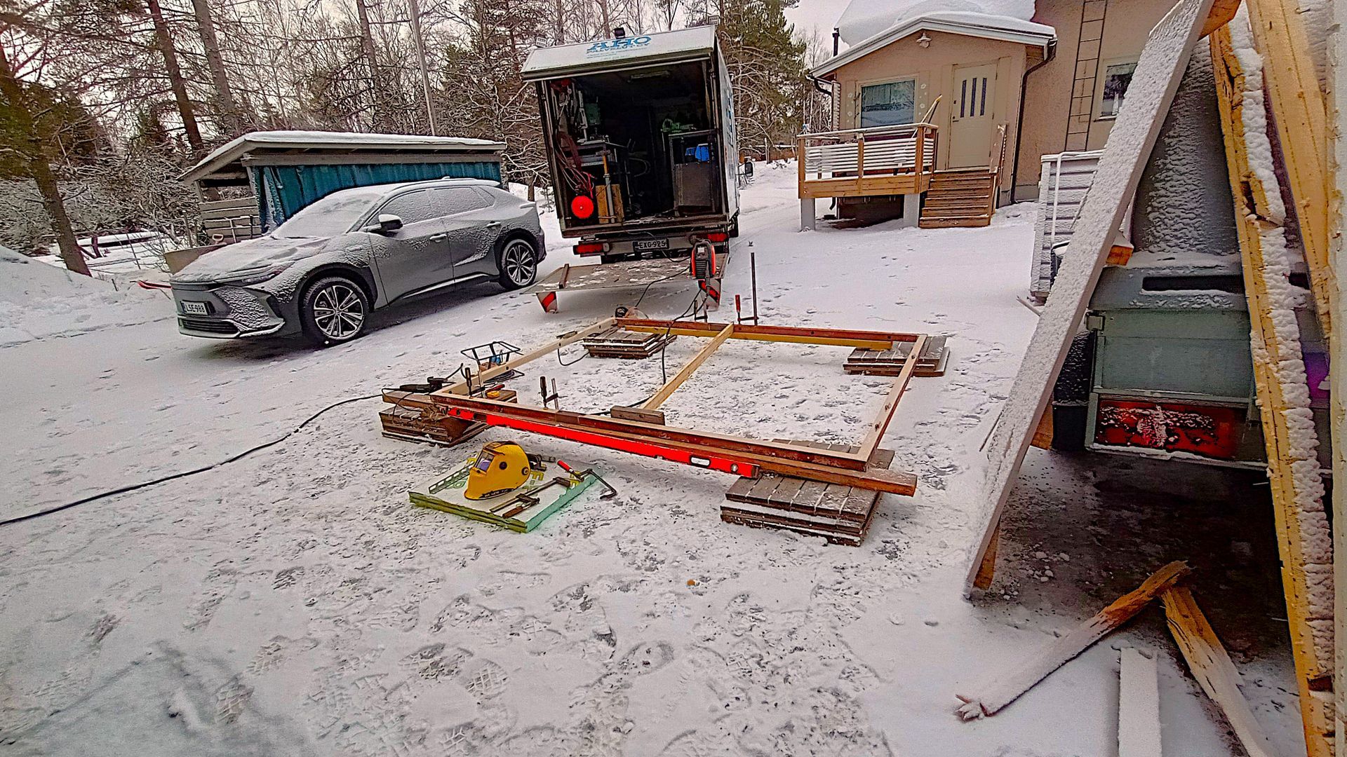 Autotallin vanha ovi purettu pois ja tässä rakennetaan ovenpieliä uutta nosto-ovea varten.