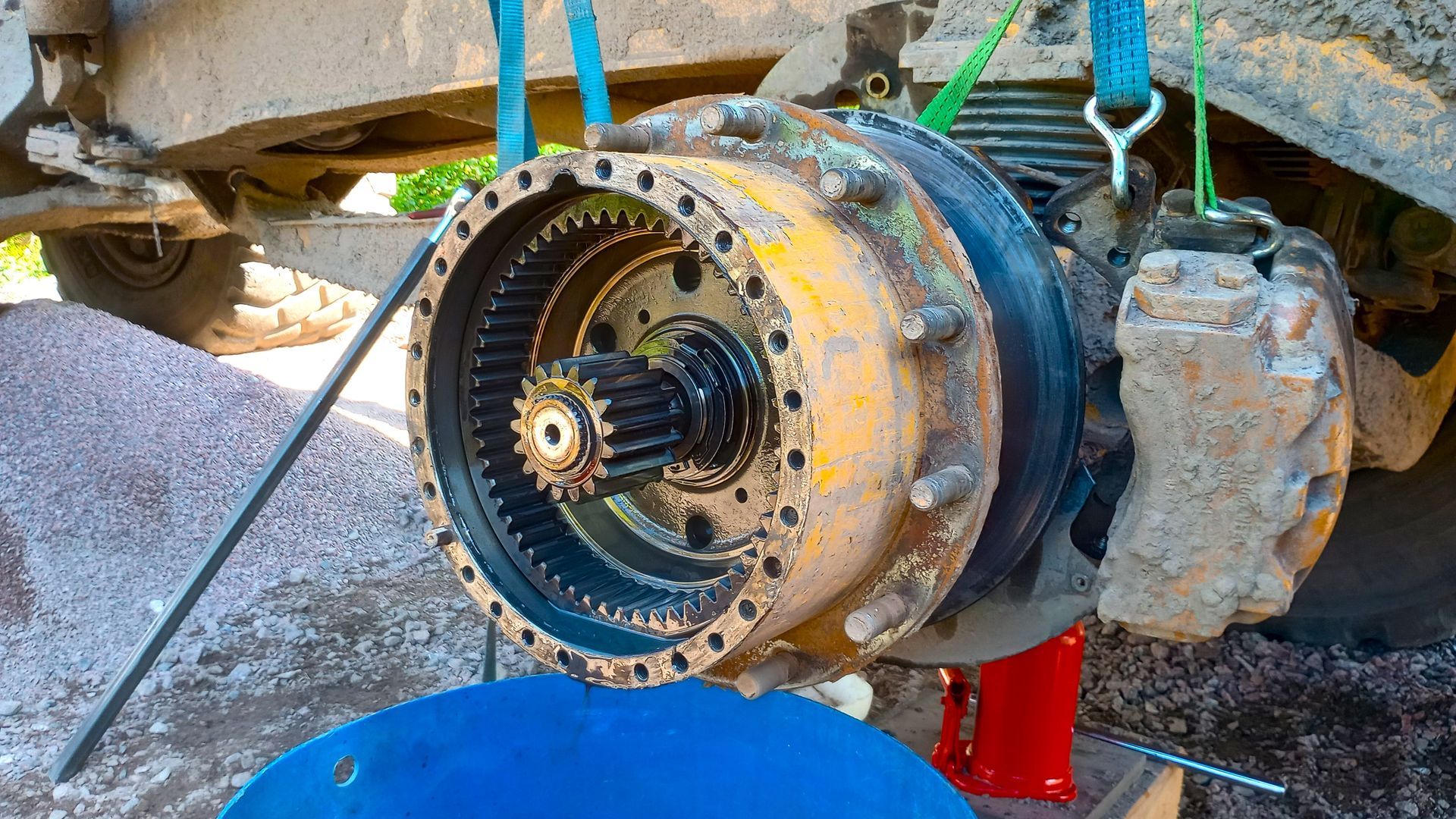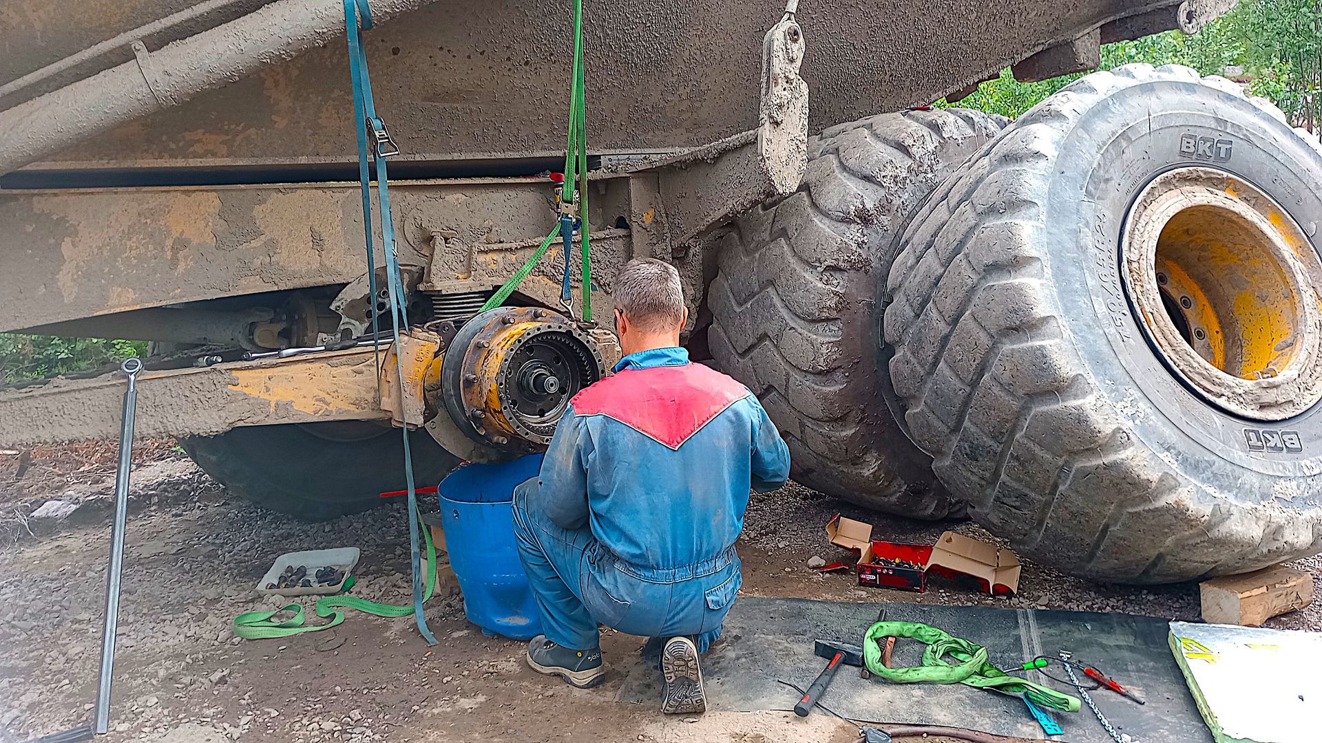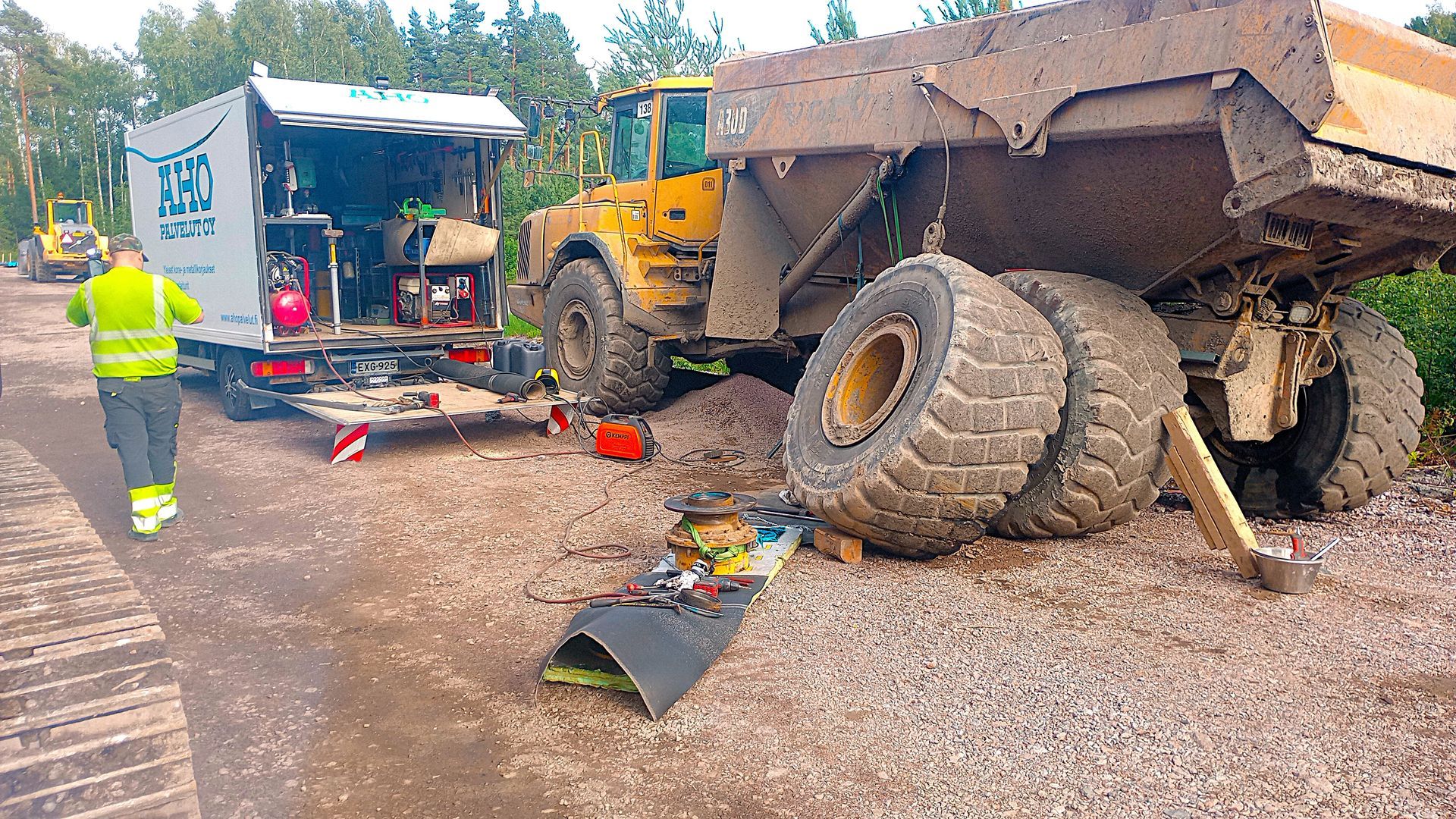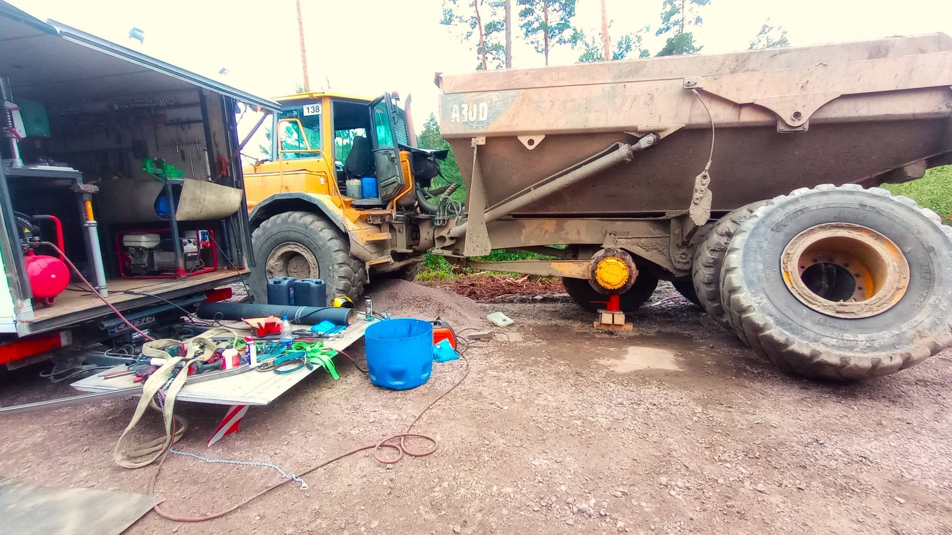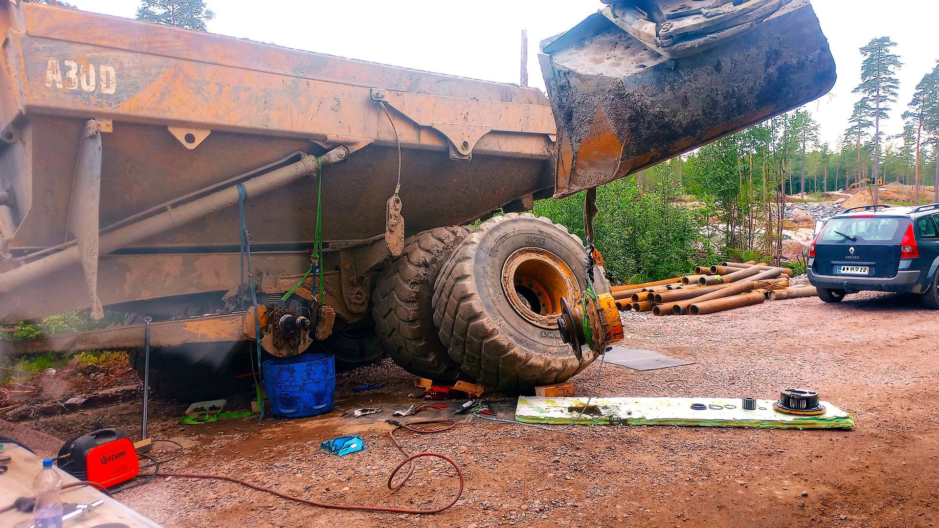 Volvo maansiirto-dumpperin pyörä vuoti öljyä. Vian selvitys ja korjaus kenttäolosuhteissa.