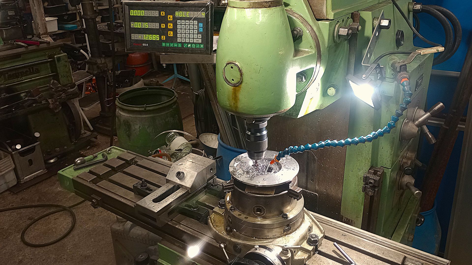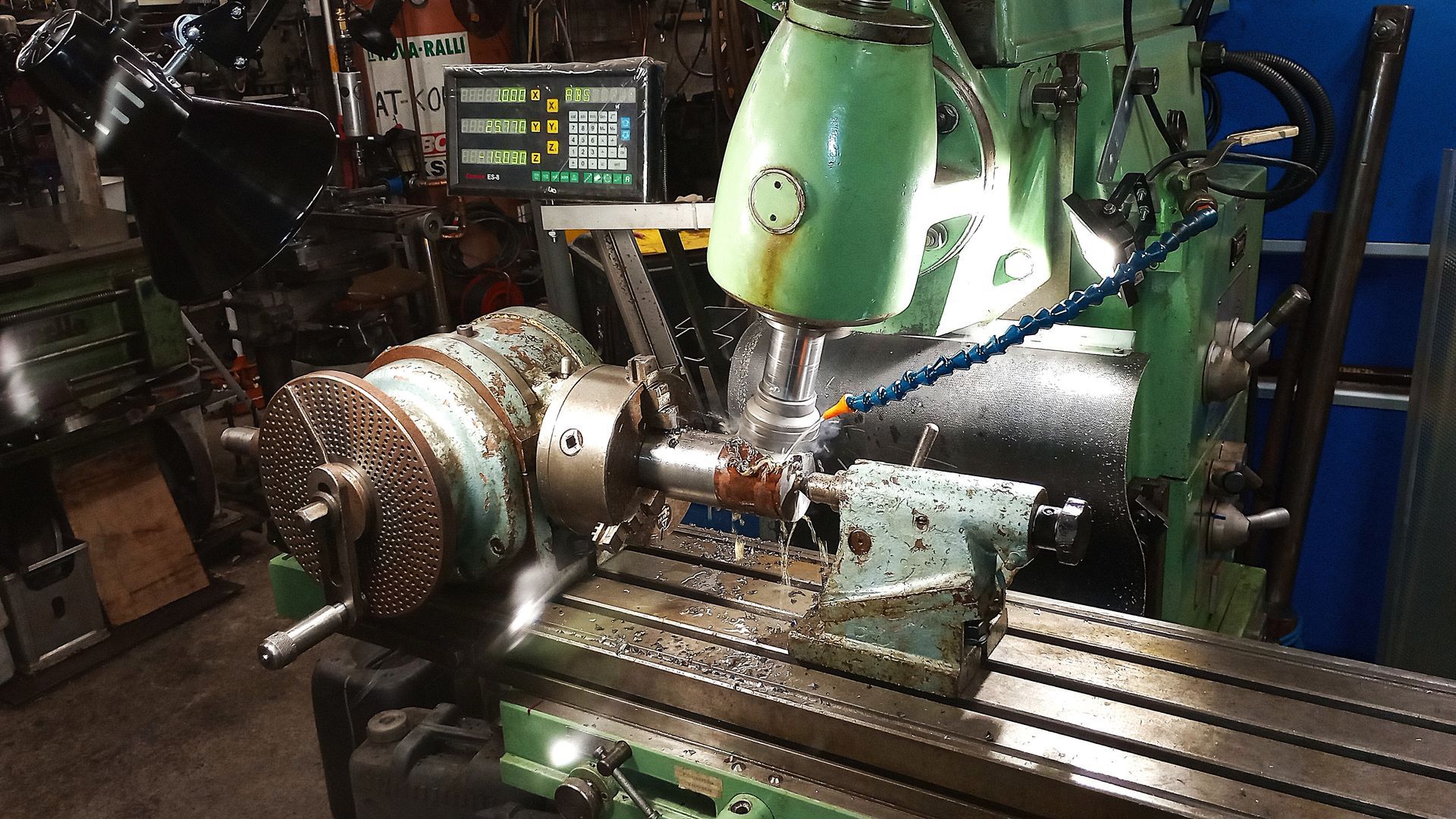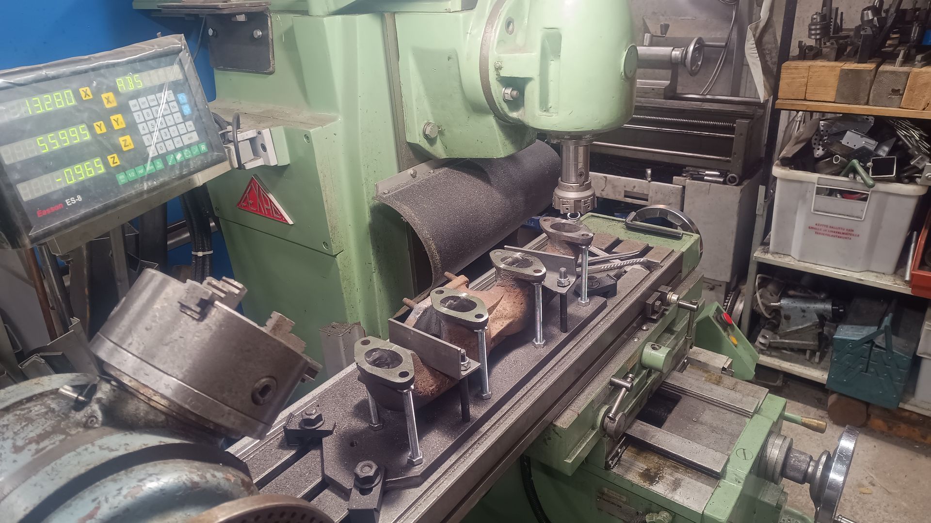 Pahasti hajonneen Valmet 411CS moottorin pakosarja. Kiinnityspintojen koneistus työn alla.