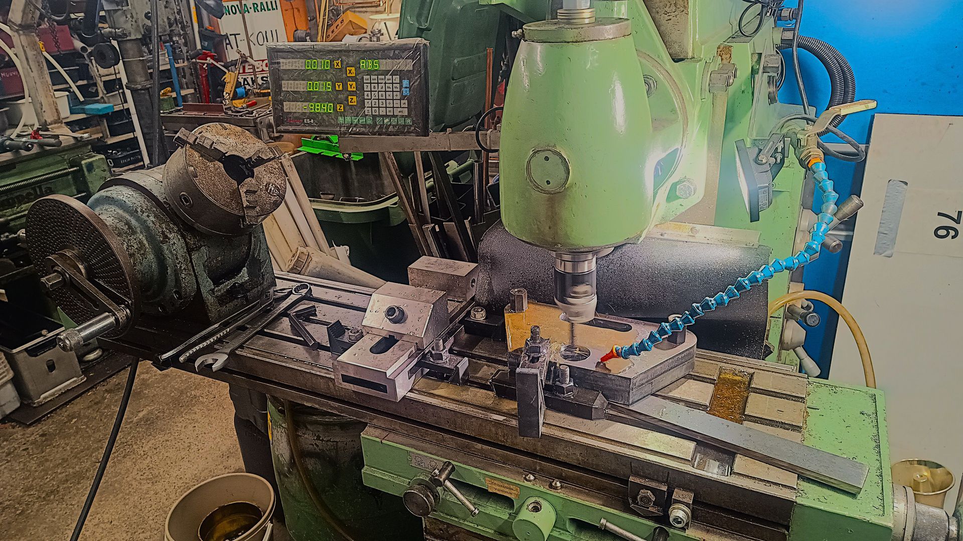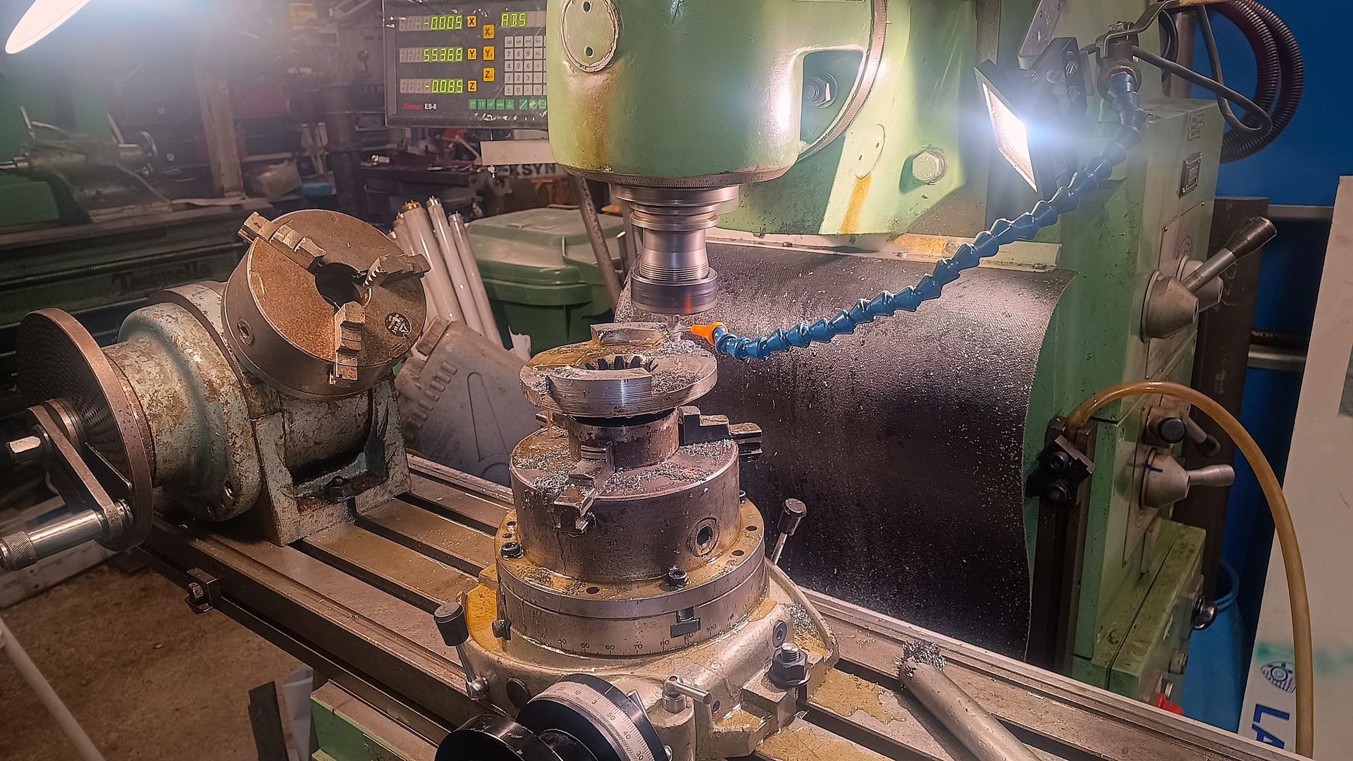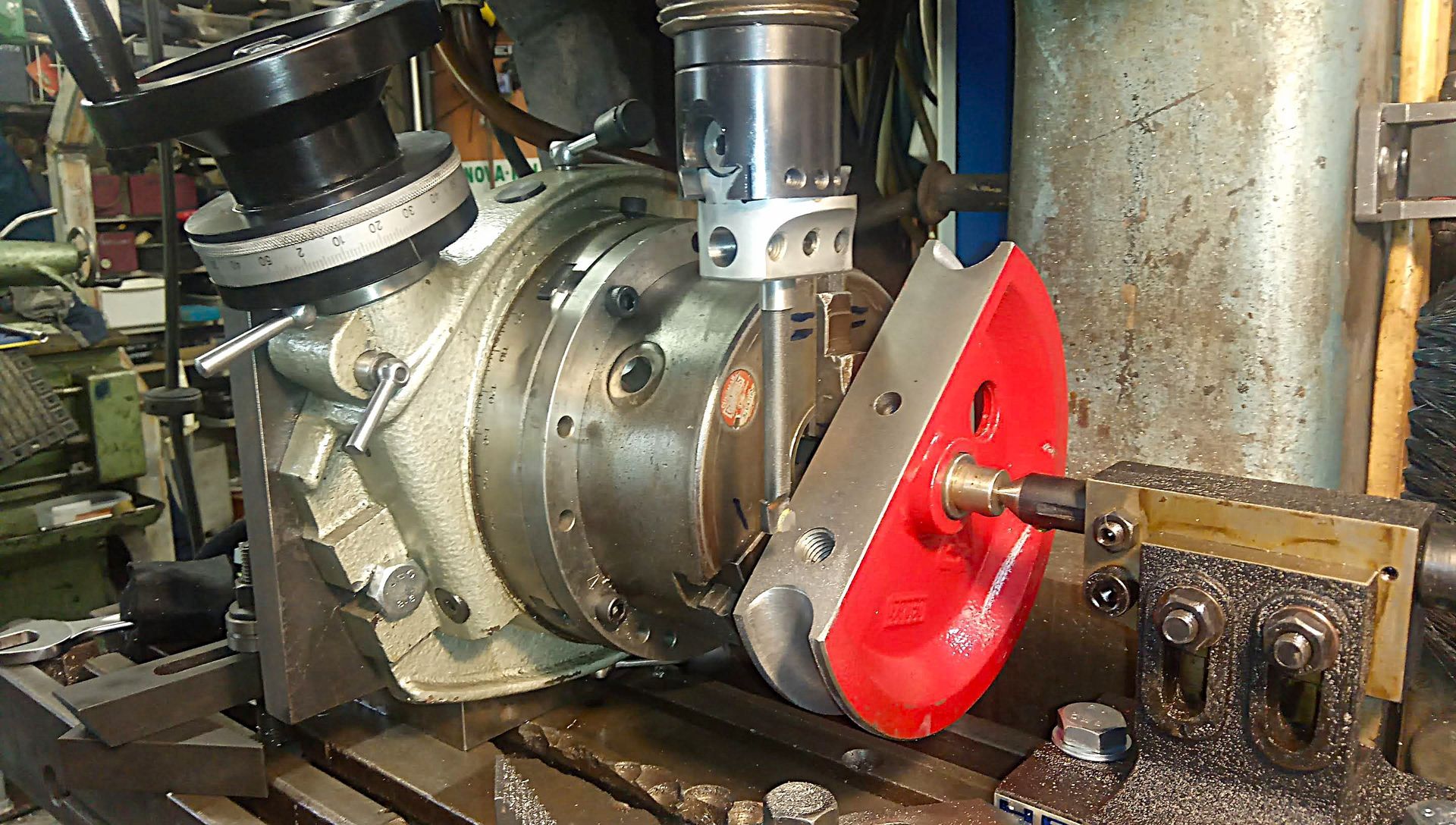 Pahasti hajonneen Valmet 411CS moottorin pakosarja. Kiinnityspintojen koneistus työn alla.