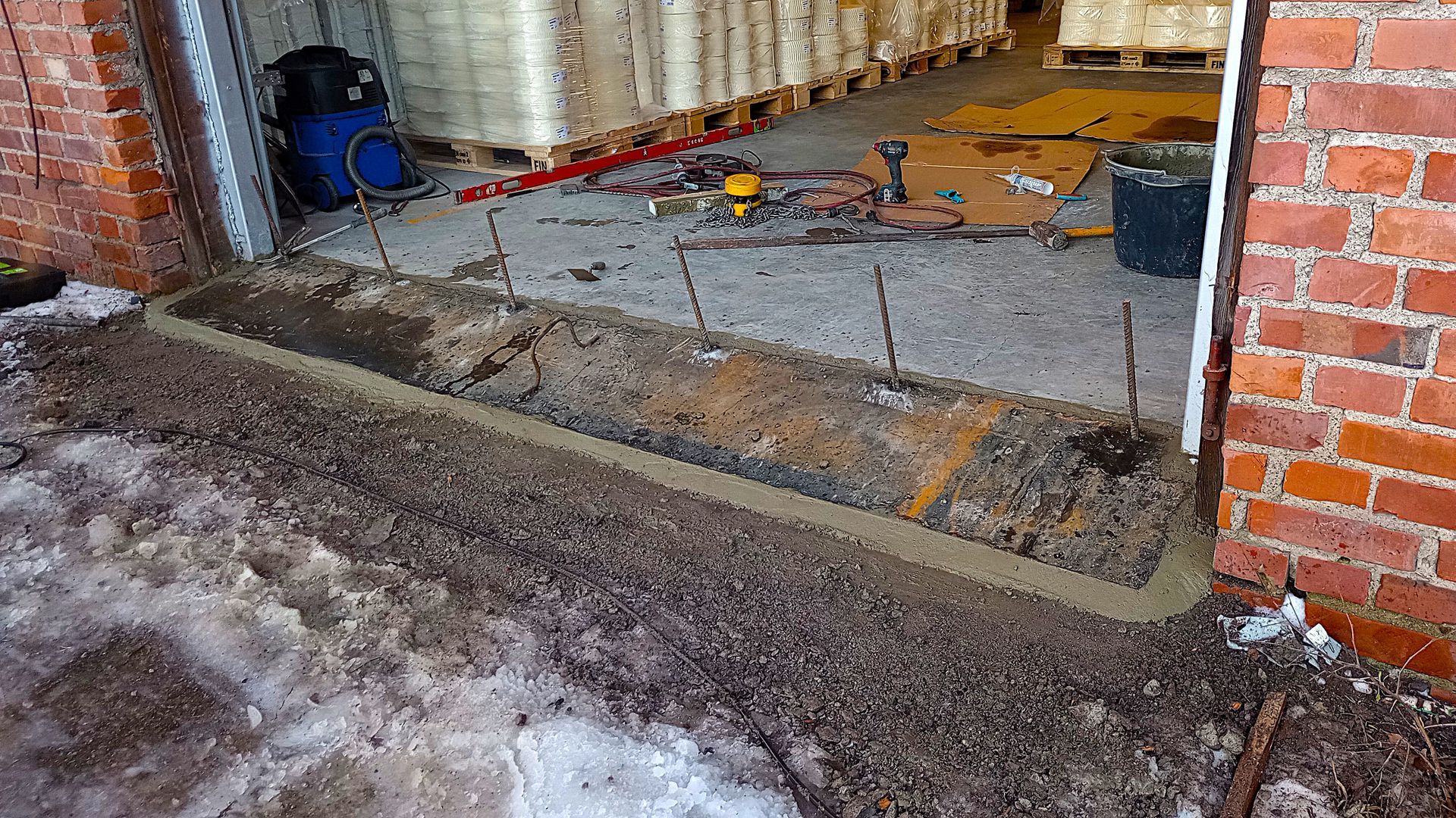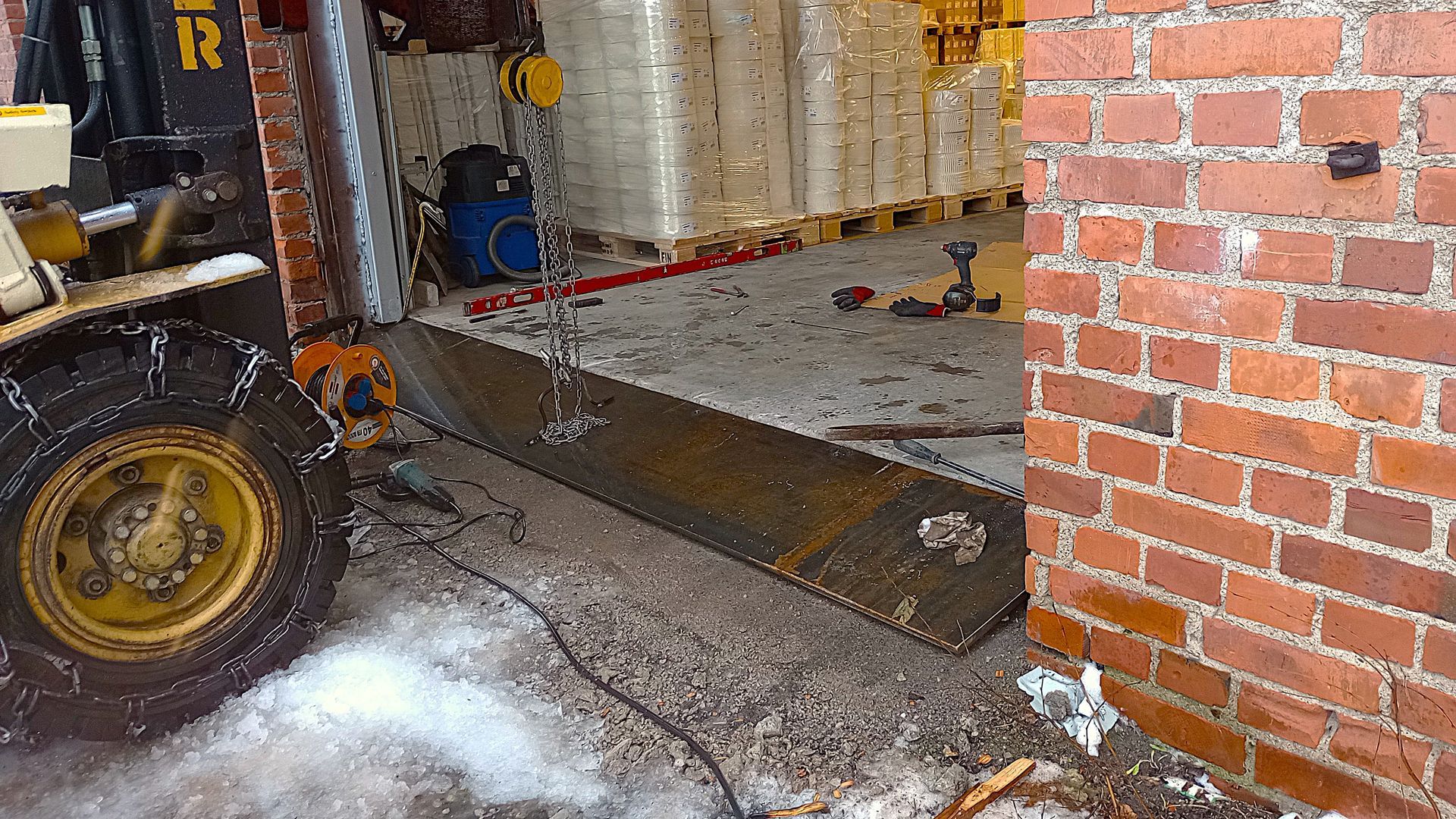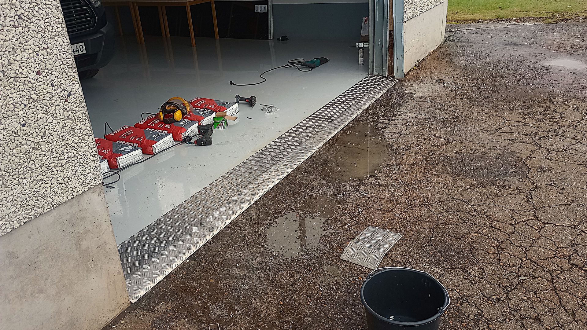 Rakennettu erittäin järeä kynnysluiska hallin oviaukkoon. Tästä ajaa raskas trukki jolla hankaluuksia päästä kynnyksen yli, koska meinaa ottaa pohjaan kiinni. Siksi levy, joka on 20mm paksu, tehtiin sen verran syvyydeltään leveä, että loiventaa nousua.