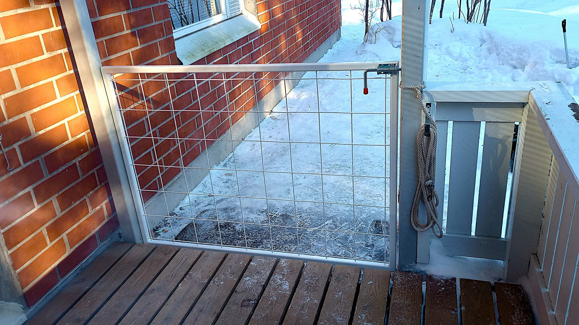 Taloyhtiön roskakatoksen saranoiden uusinta koska entiset olivat ruostuneet poikki.