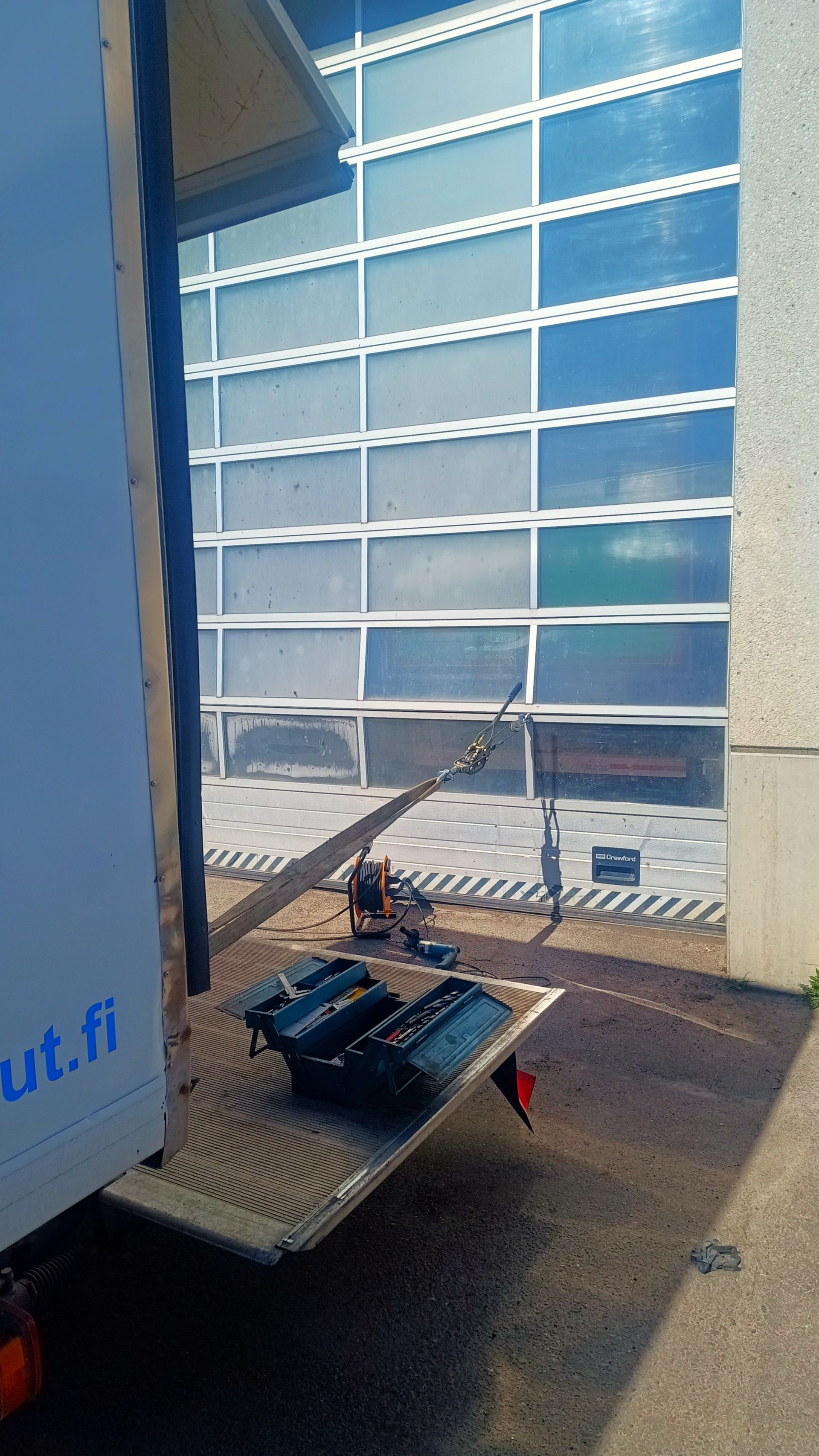 Teollisuushallin vääntyneen nosto-ovi panelin oikomista.