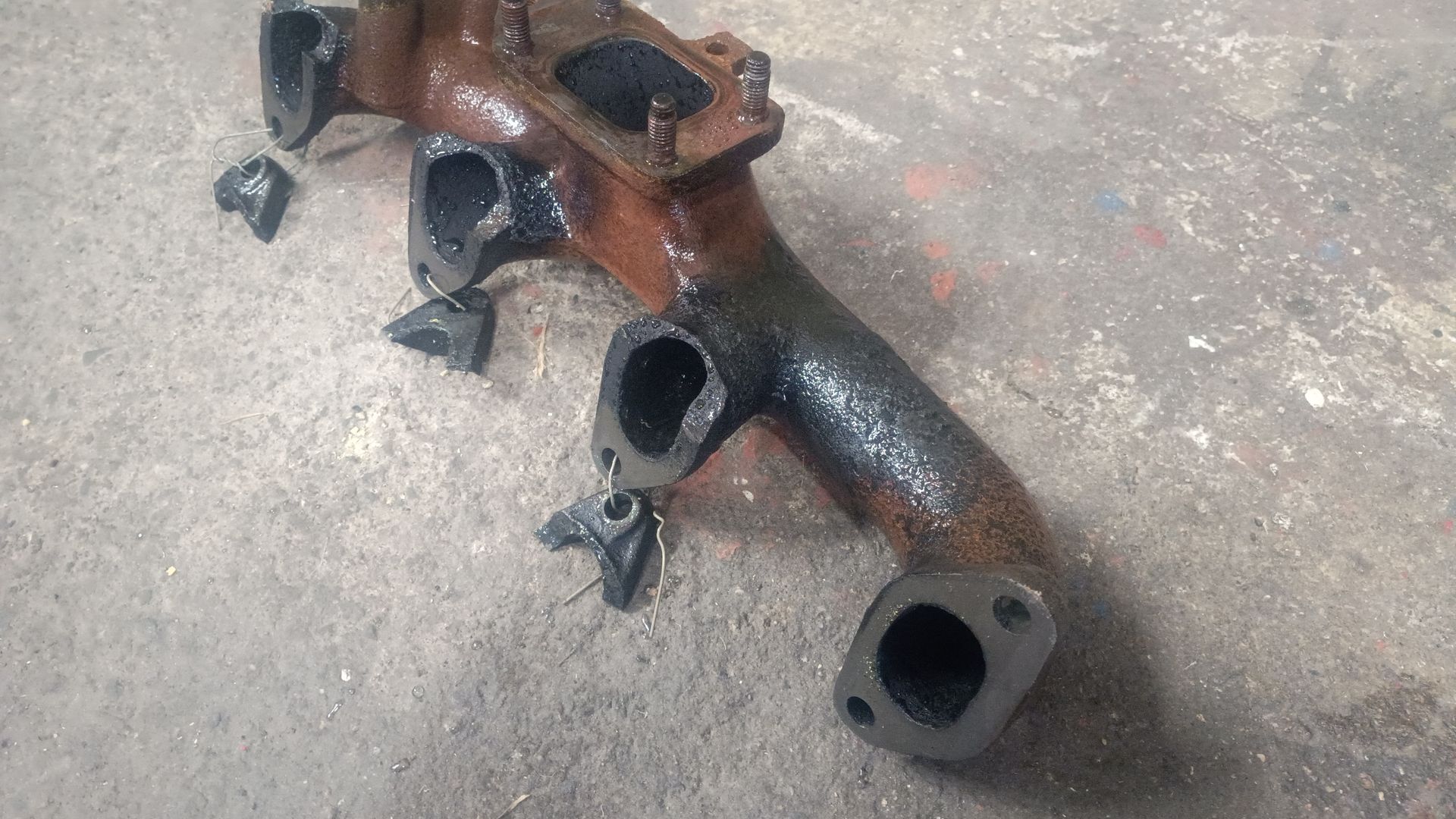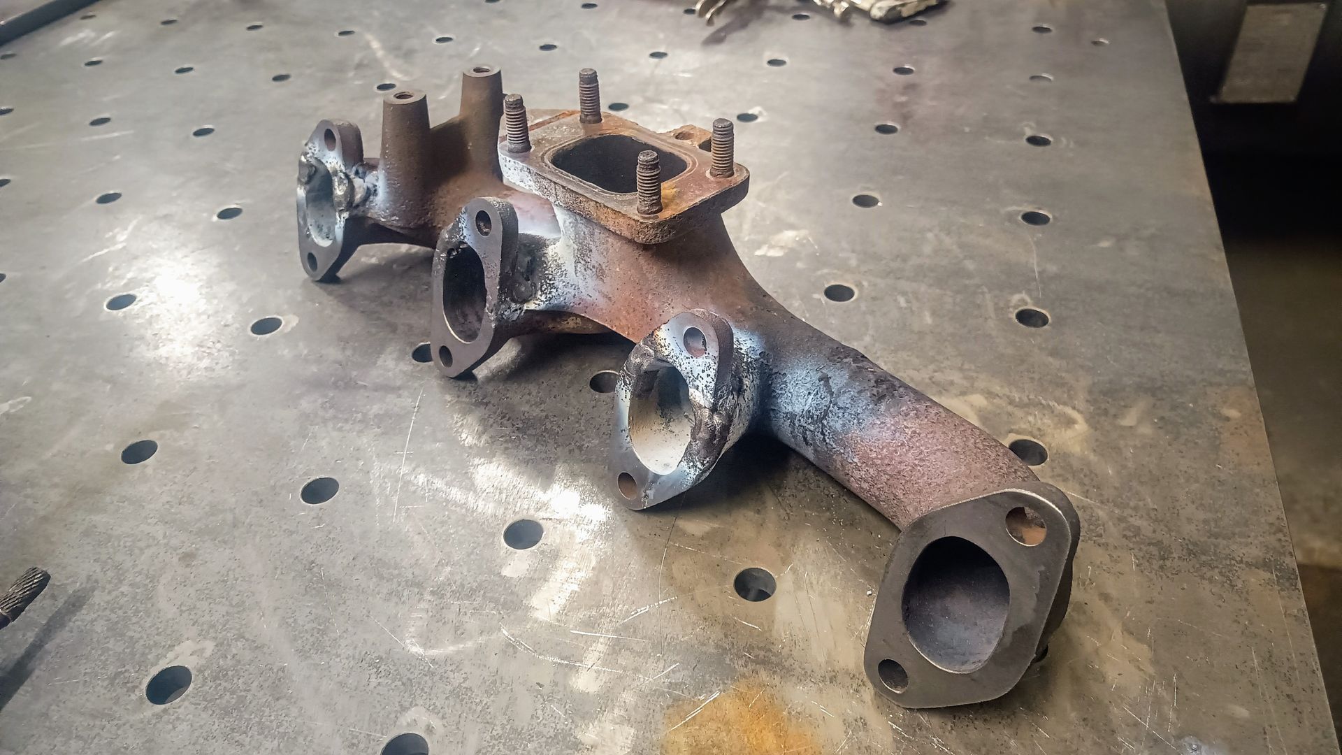 Pahasti hajonneen Valmet 411CS moottorin pakosarja korjaushitsauksen jälkeen. Seuraava työvaihe kiinnityspintojen koneistus.