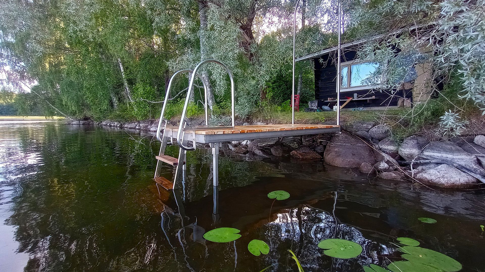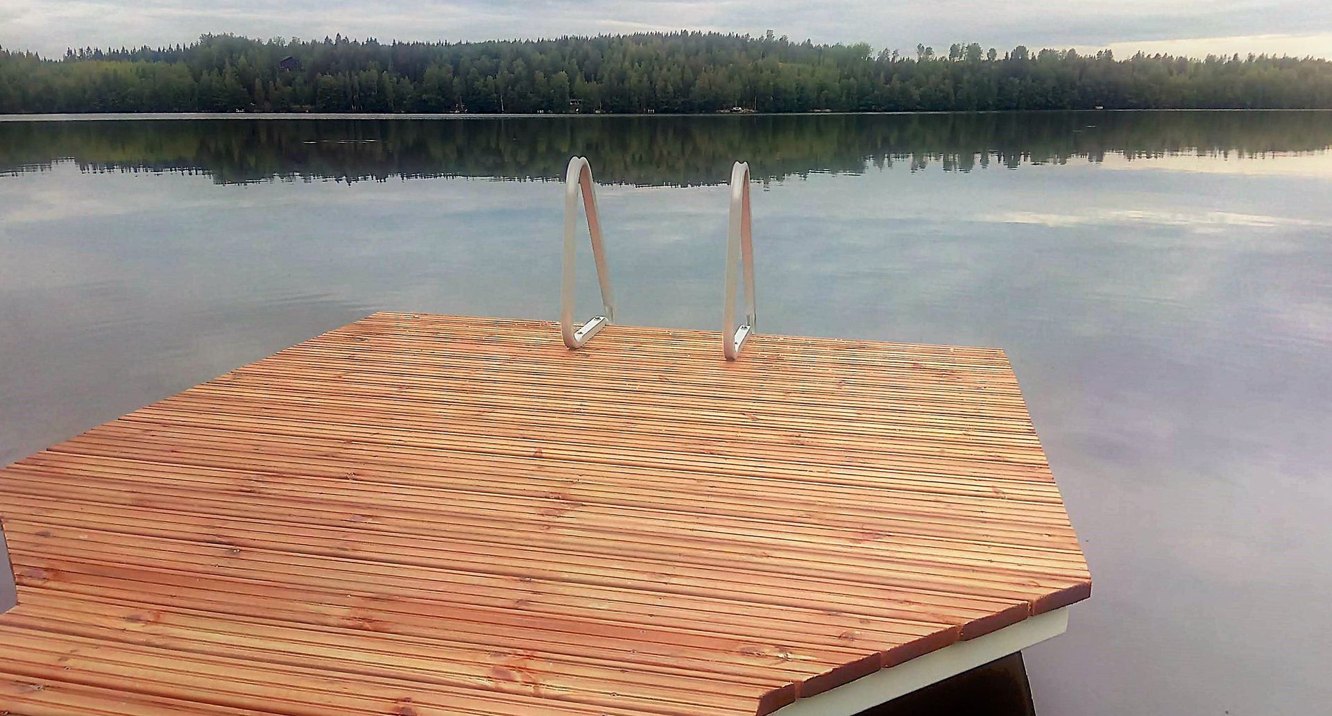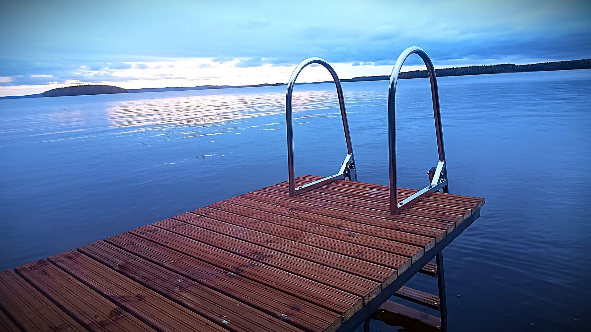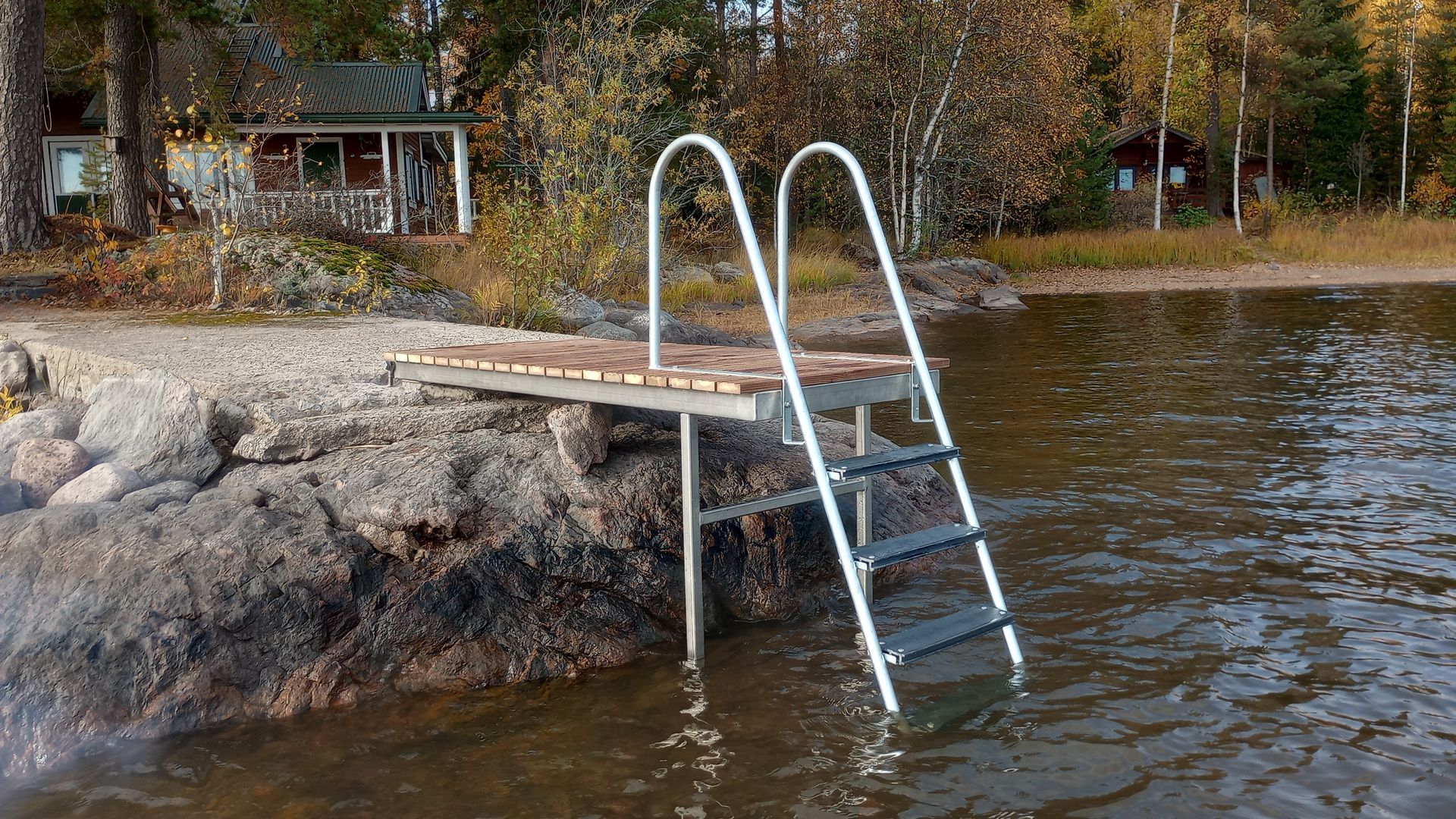 Lyhyt kaksimetrinen ruostumattomasta teräksestä valmistettu nostolaituri. Pinnat ruskeaa kestopuuta ja tikkaat kuumasinkityt johon räätälöity vinyylilankusta askelmat. Tämä on ns.ikuinen laituri. Erittäin helppo nostaa talviteloille ettei jäät murjo. Samoin keväällä yhtä helppo laskea veteen. Kuvassa kesäasento.