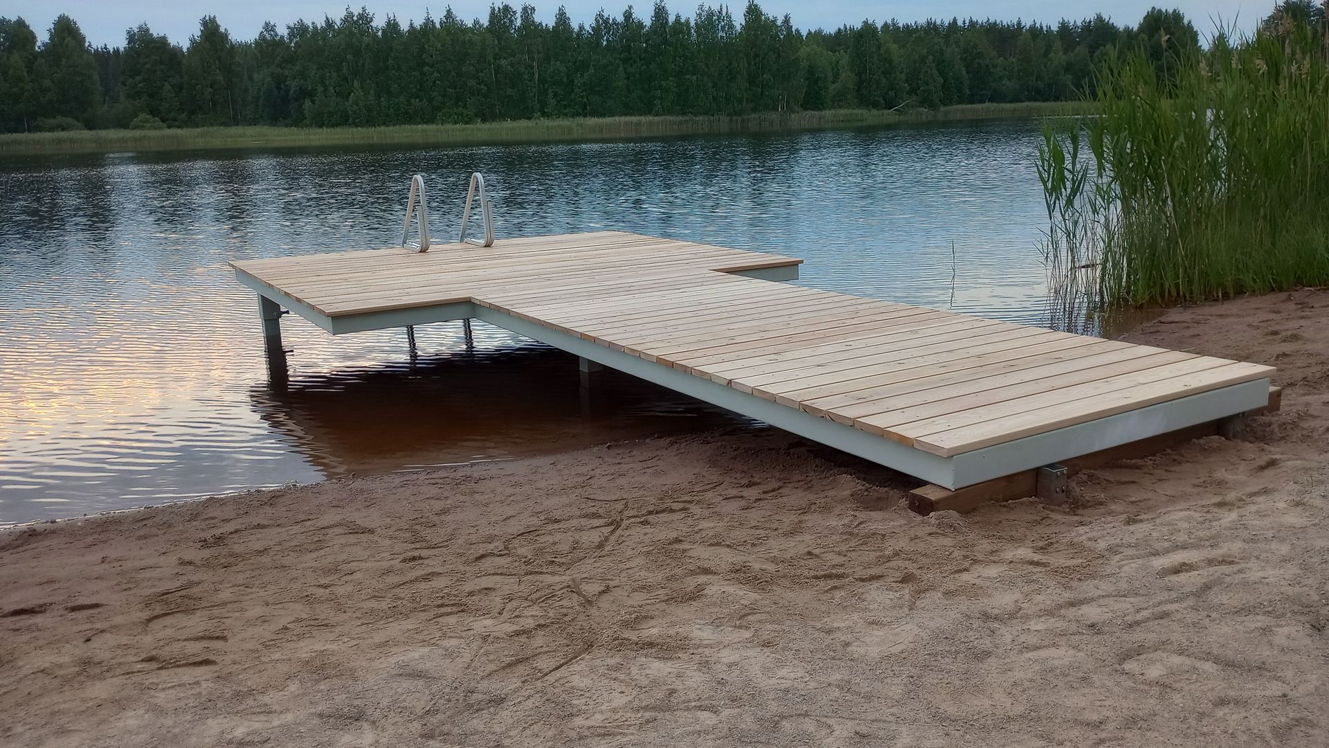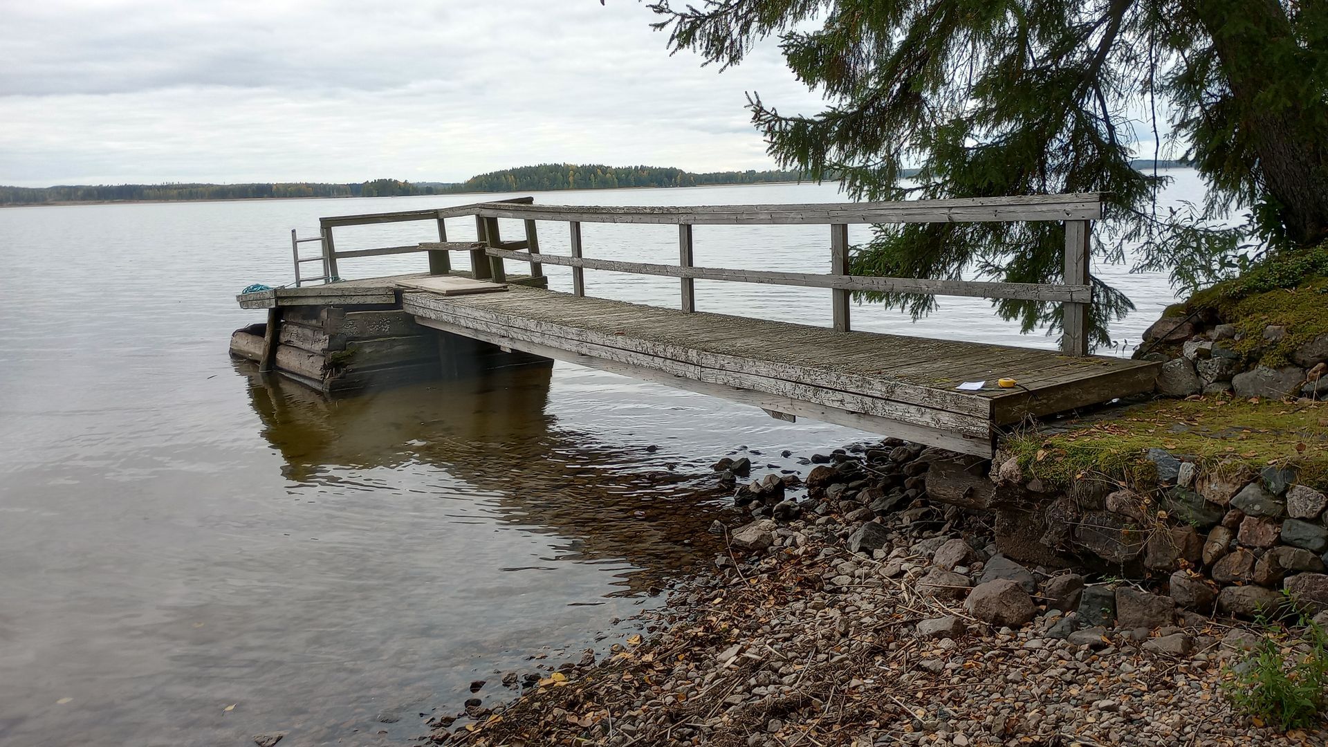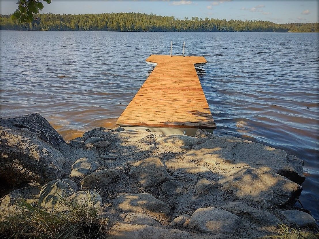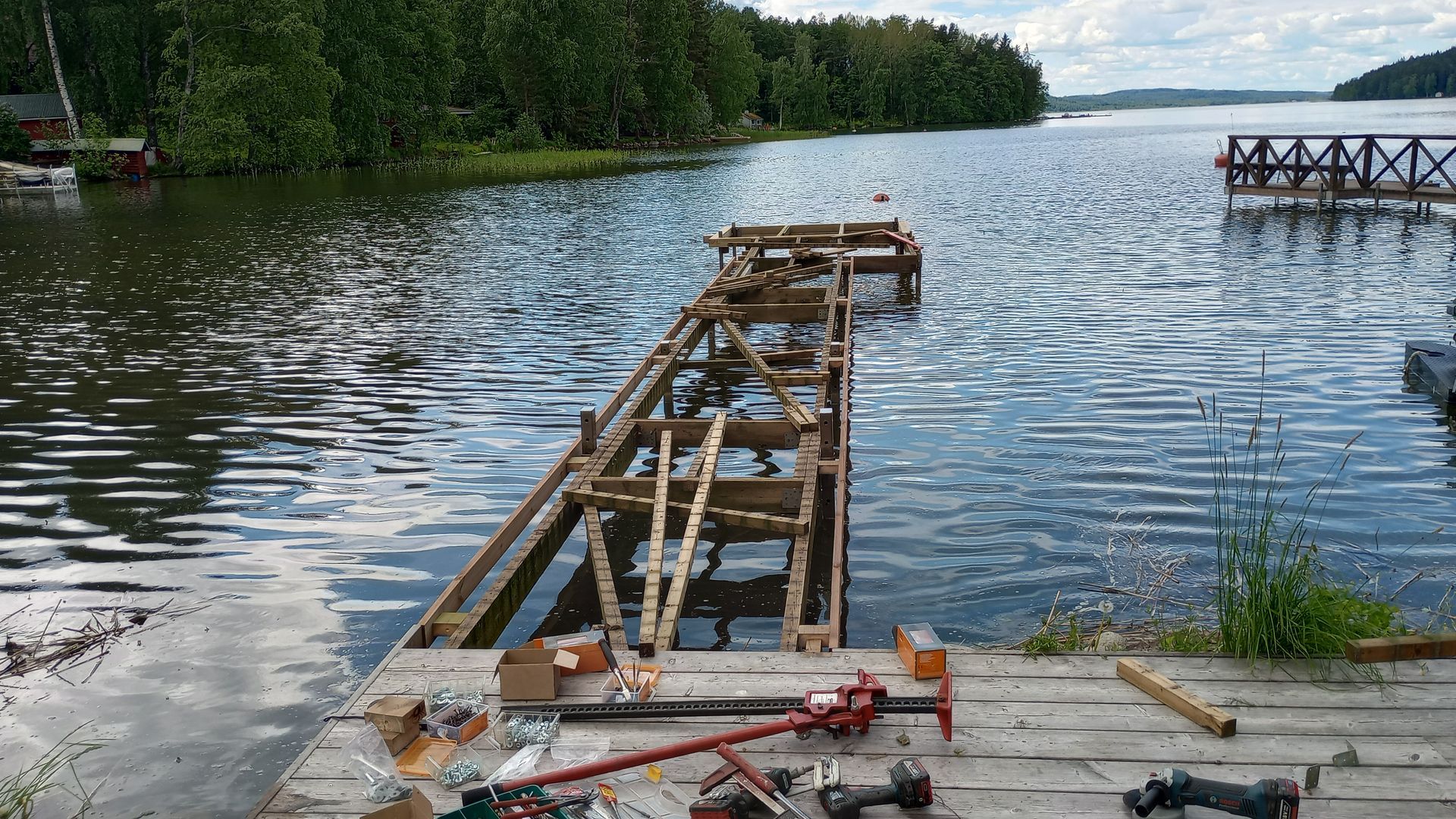 Valmis. Tässä kohteessa oli laituri jätetty ympärivuotisesti järveen ja heti ensimmäisenä keväänä meni rikki ja jäät työnsi rannalle. Haluttiin säästää suht ehjänä säilynyt ulkopää ja loppu rakennettiin uudestaan. Nyt tätäkään ei jätetä talveksi jäihin vaan helpolla siirretään talviteloille.