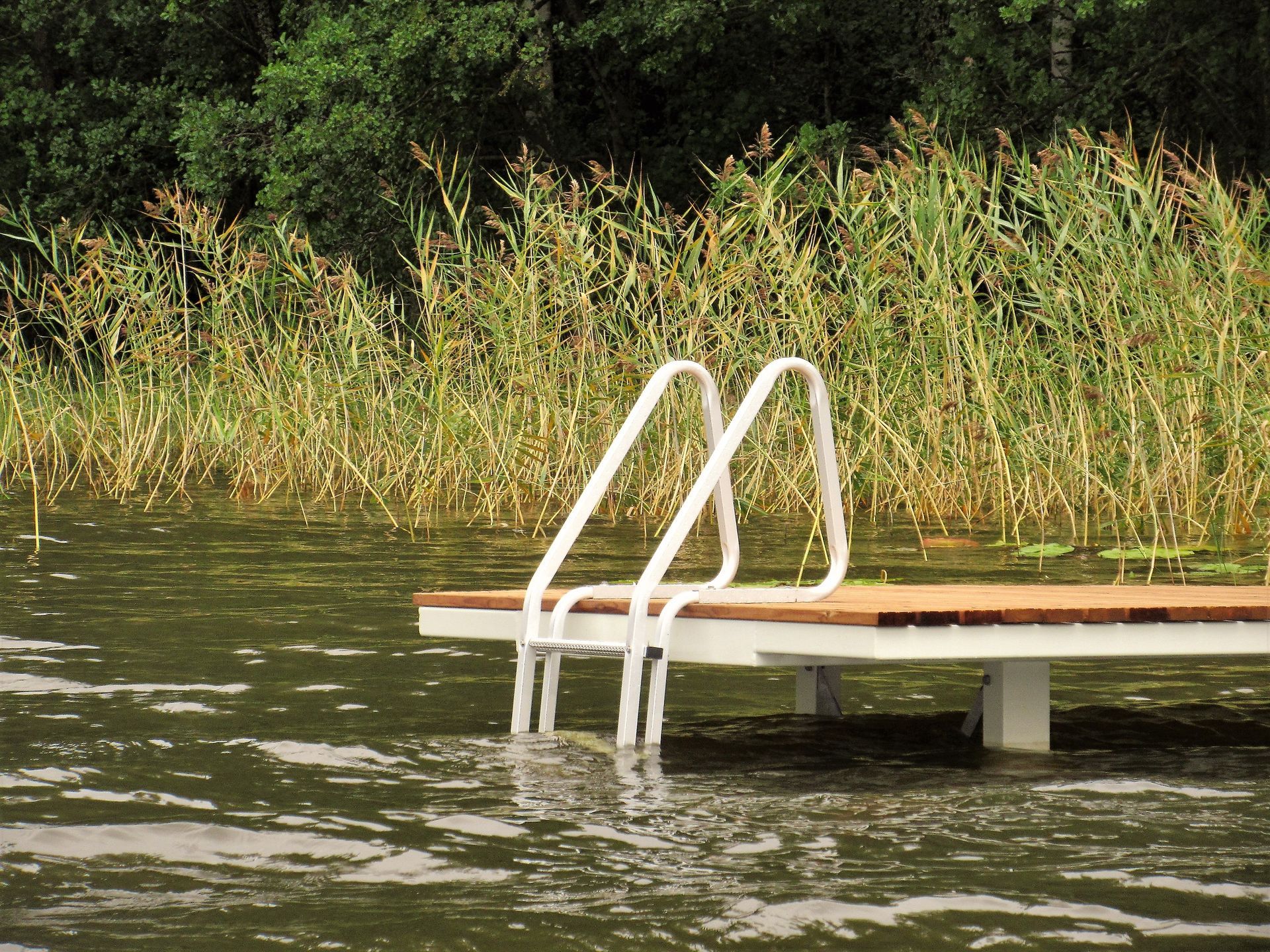 Tässä on valkoiseksi maalattu teräsrunkoinen kiinteä laituri, jossa pintapuut lehtikuusta. Tämä on asennettu niin pienelle lammelle, että tätä ei nosteta talveksi ylös.