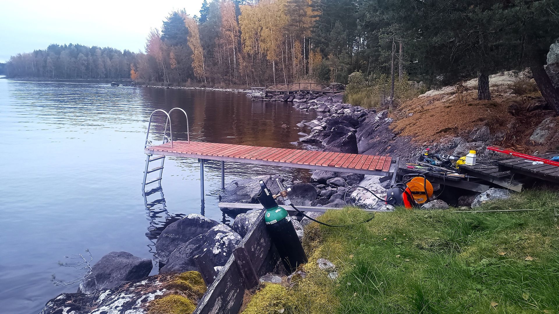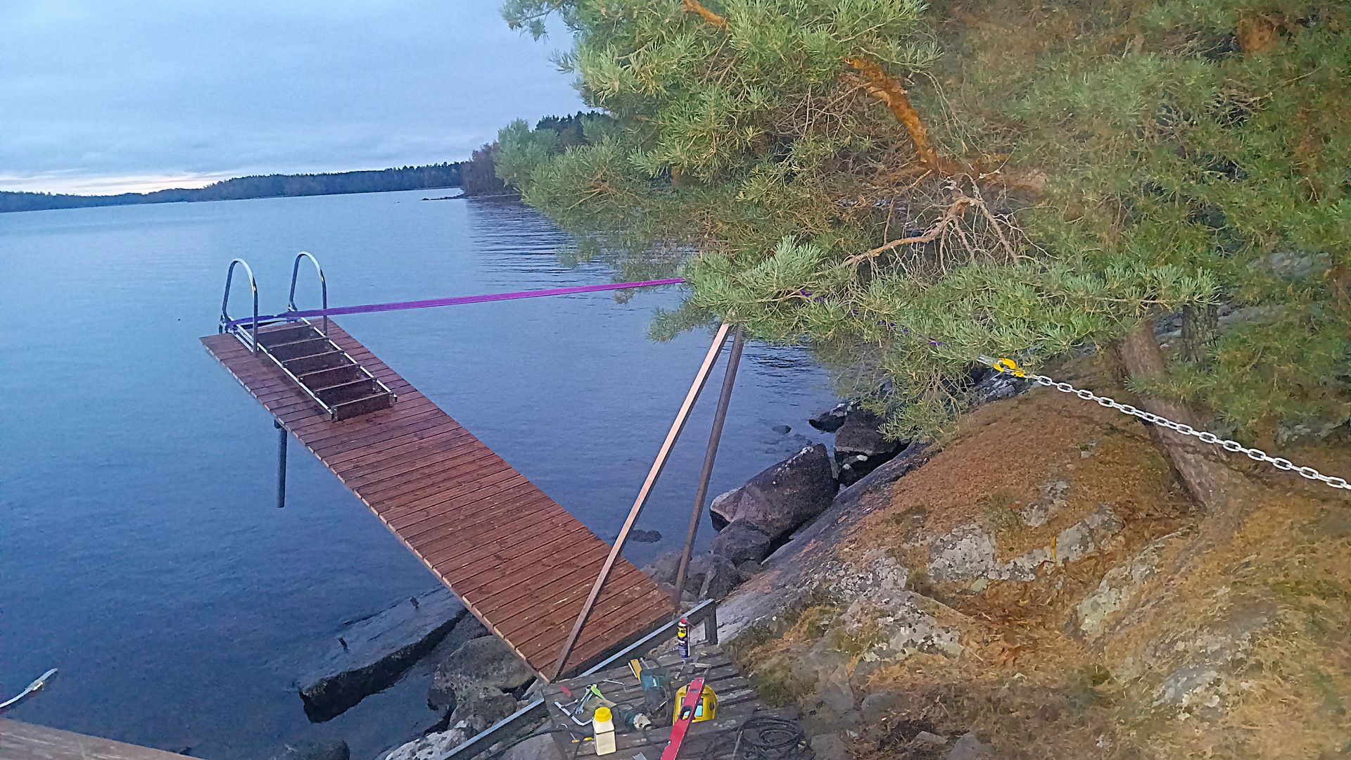 Räätälöidyissä laitureissa pyritään rakentamaan kaikkea valmiiksi jo toimipisteellä, mutta lopulliset rakentelut tarvitsee tehdä kohteessa. Näin kaikki istuu juuri siihen kohteeseen oikein. Tässä kohteessa rantakiinnitys kallioon/kiveen. Suomalainen kallio on ihanteellinen kohde rakentaa. Siihen kun kiinnittää, tietää, että varmasti pysyy.