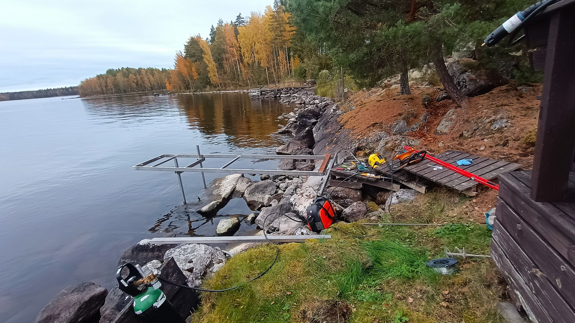 Vanha romuttunut laituri on jo poistettu ja uuden 4,5m pitkän nostolaiturin rantakiinnityksen rakentaminen käynnissä.