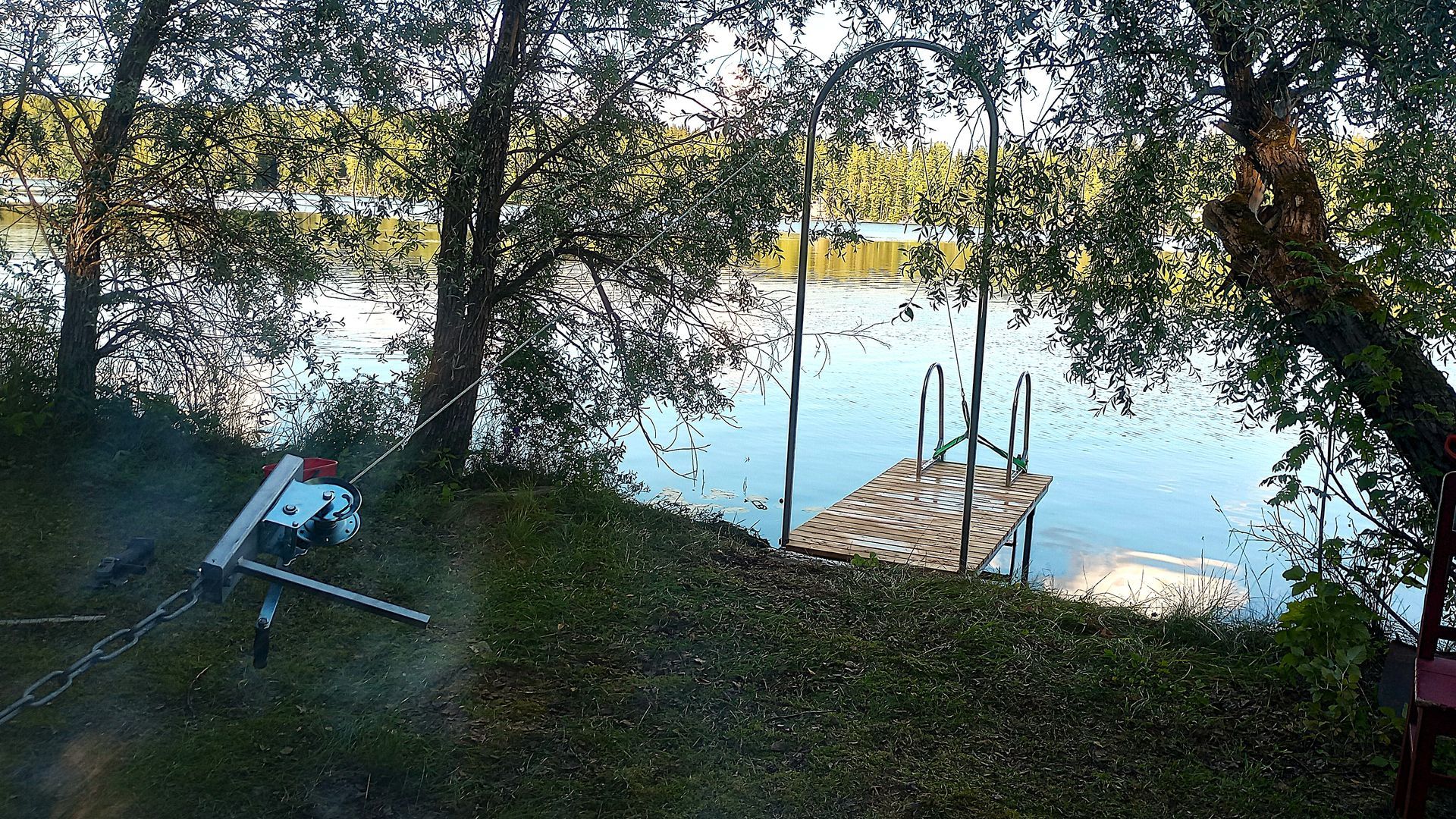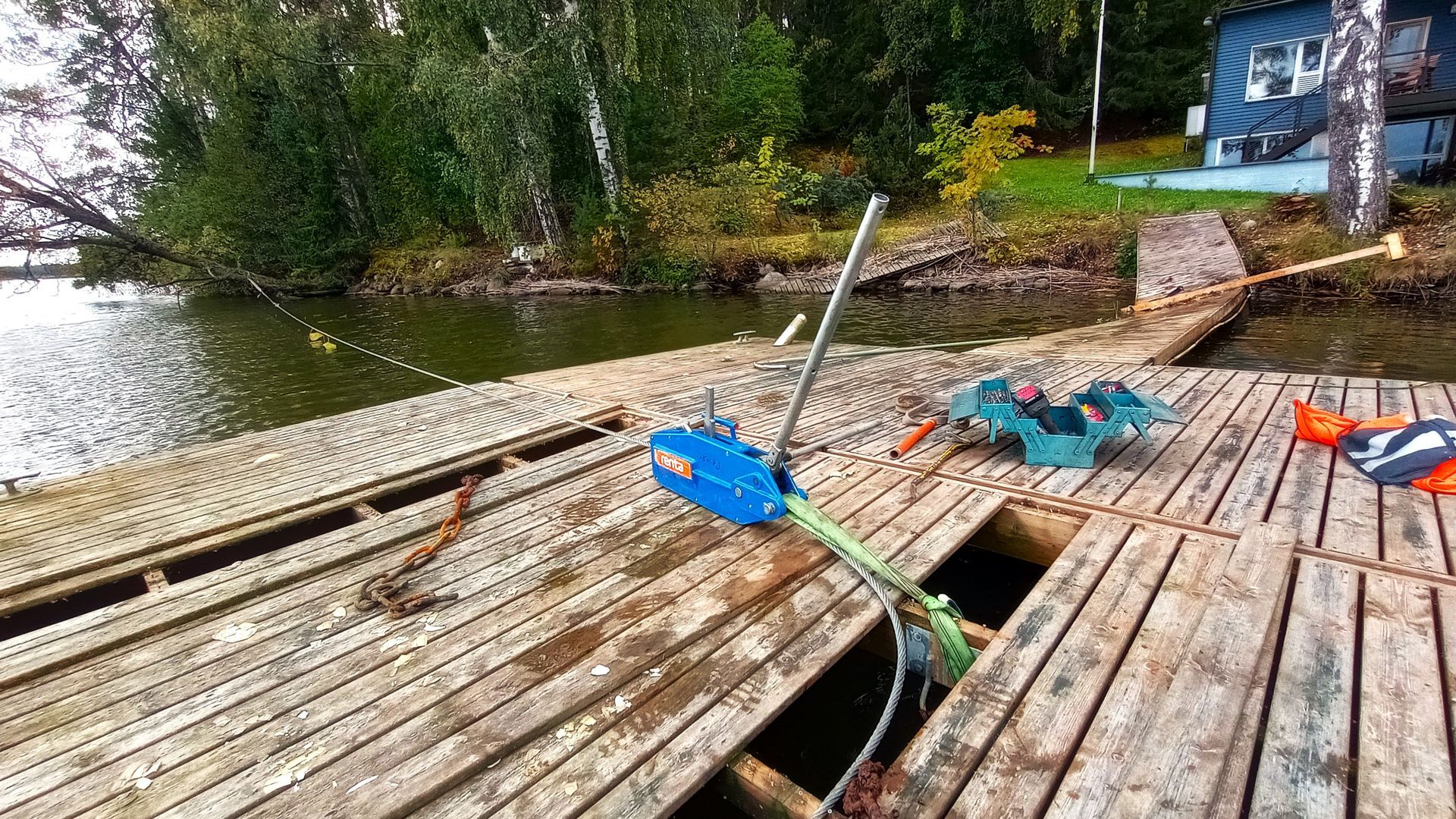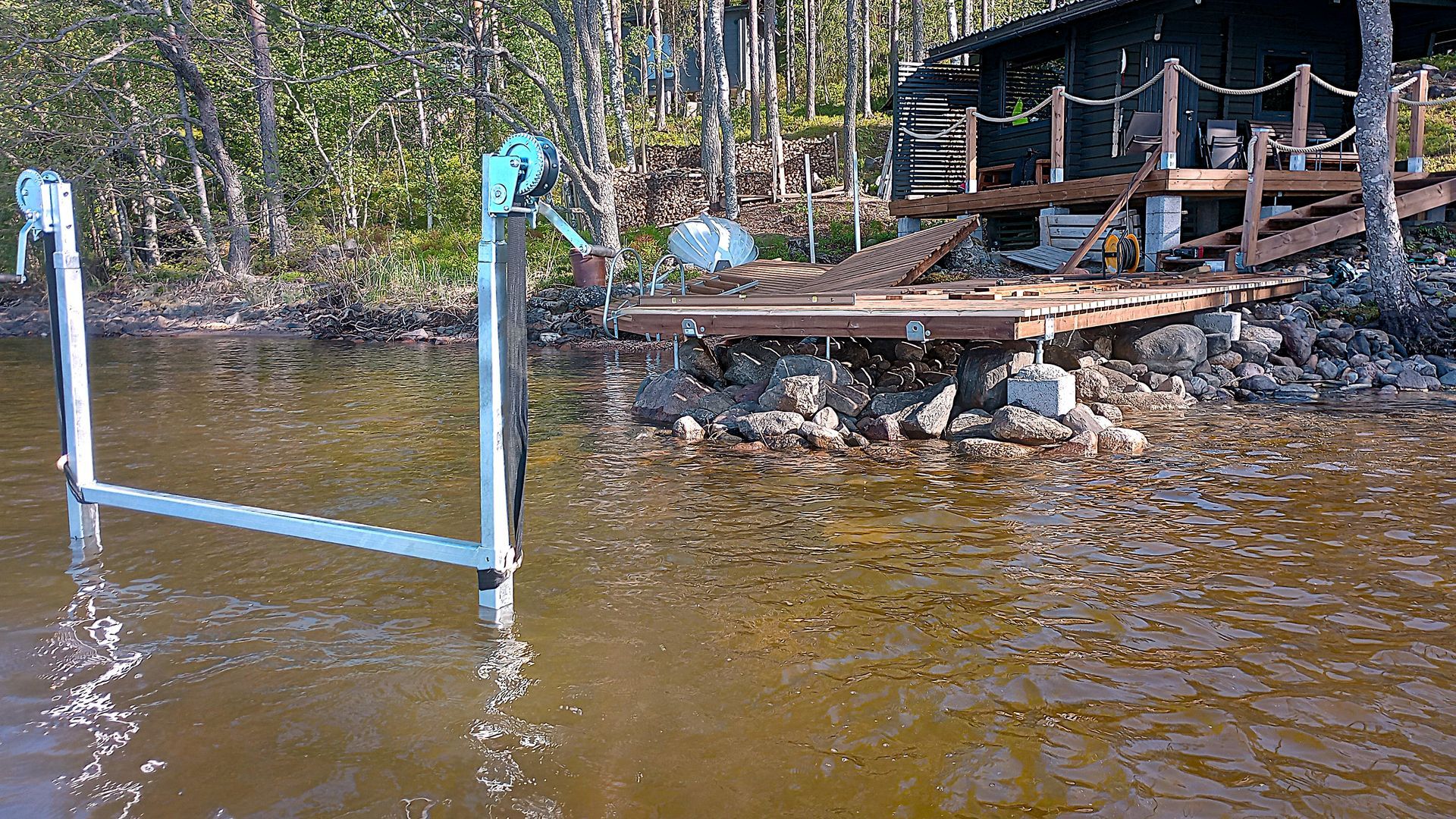 Rantakiinnitys valmis ja pääsee ensimmäisen kerran testaamaan laiturin nostoa. Tässä laiturin kaari nostetaan kesäksi pois, samoin tietysti nostoliina vinsseineen. Kuvassa talviasento.