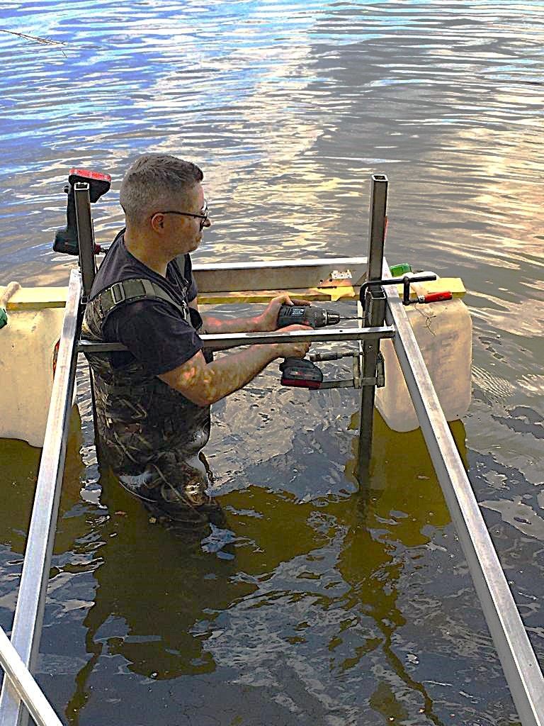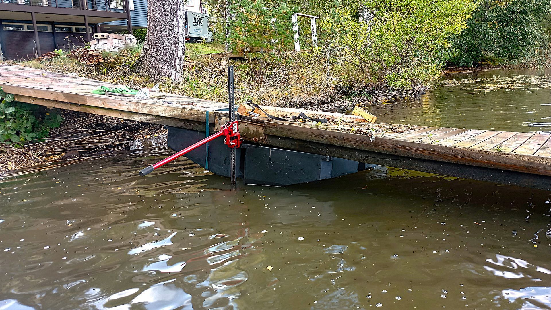 Vaikka emme valmista ponttoonilaitureita, niin silloin tällöin käymme korjaamassa niitäkin. Tässä on ponttoonilaiturin pohjakiinnitykset luistaneet ja yksi ketjukin poikki. Keskinivelen ponttooni mennyt puhki pohjaan hieromisen takia.